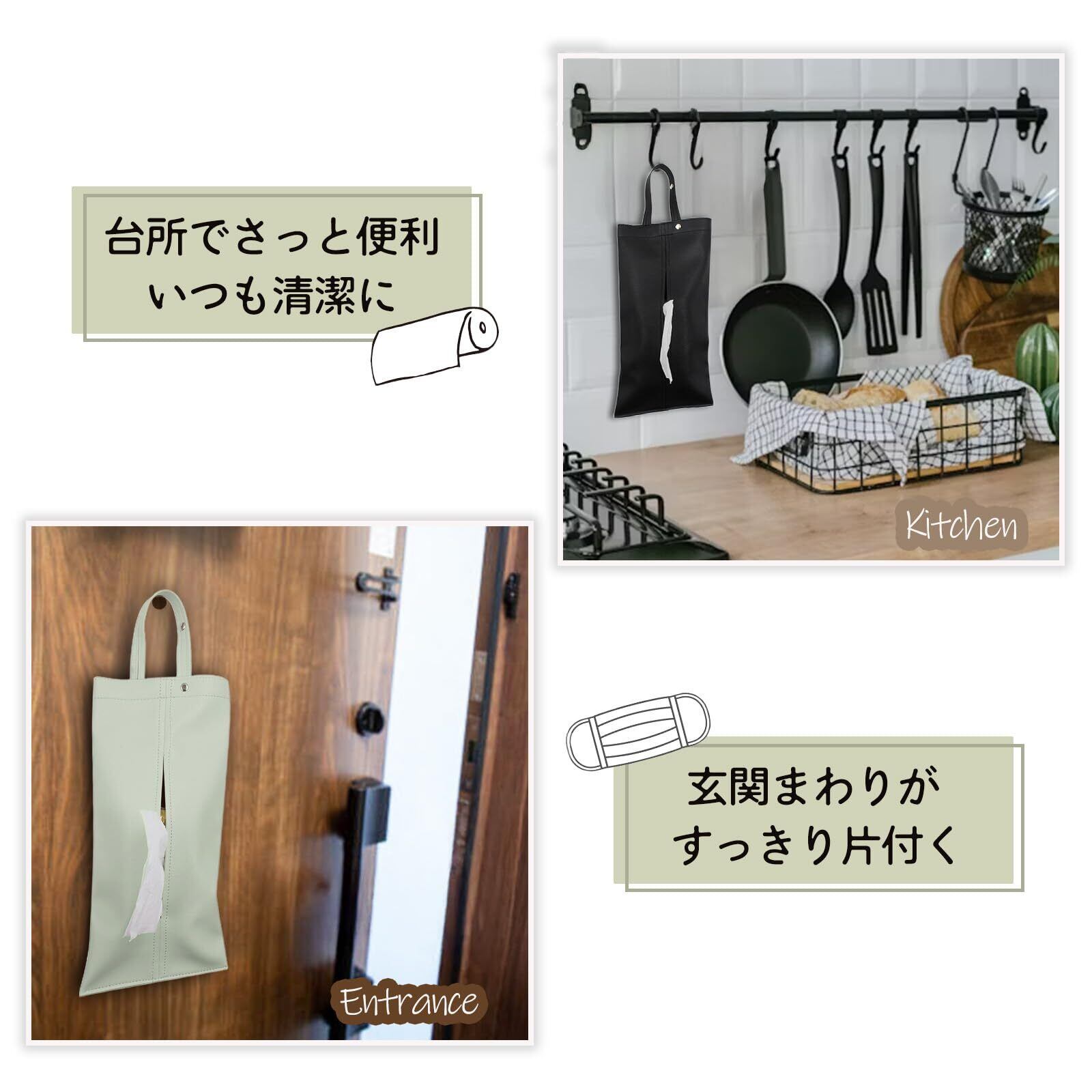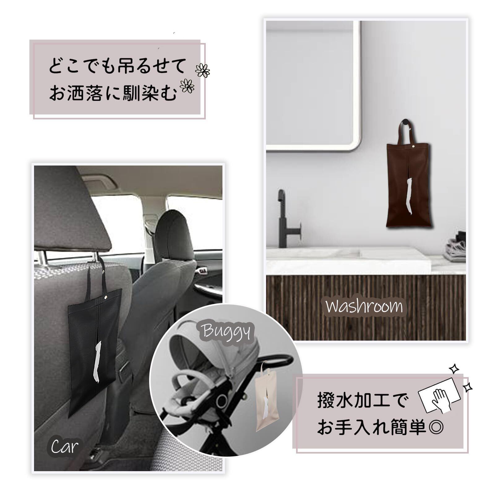 【吊り下げ&置き型の2WAY仕様】 車のヘッドレスト、ベビーカー、キッチン、洗面所など、どこでも吊り下げて使える便利なティッシュケース。横置きすればシンプルなおしゃれインテリアとしても活躍し、省スペースでスマートに収納できます。