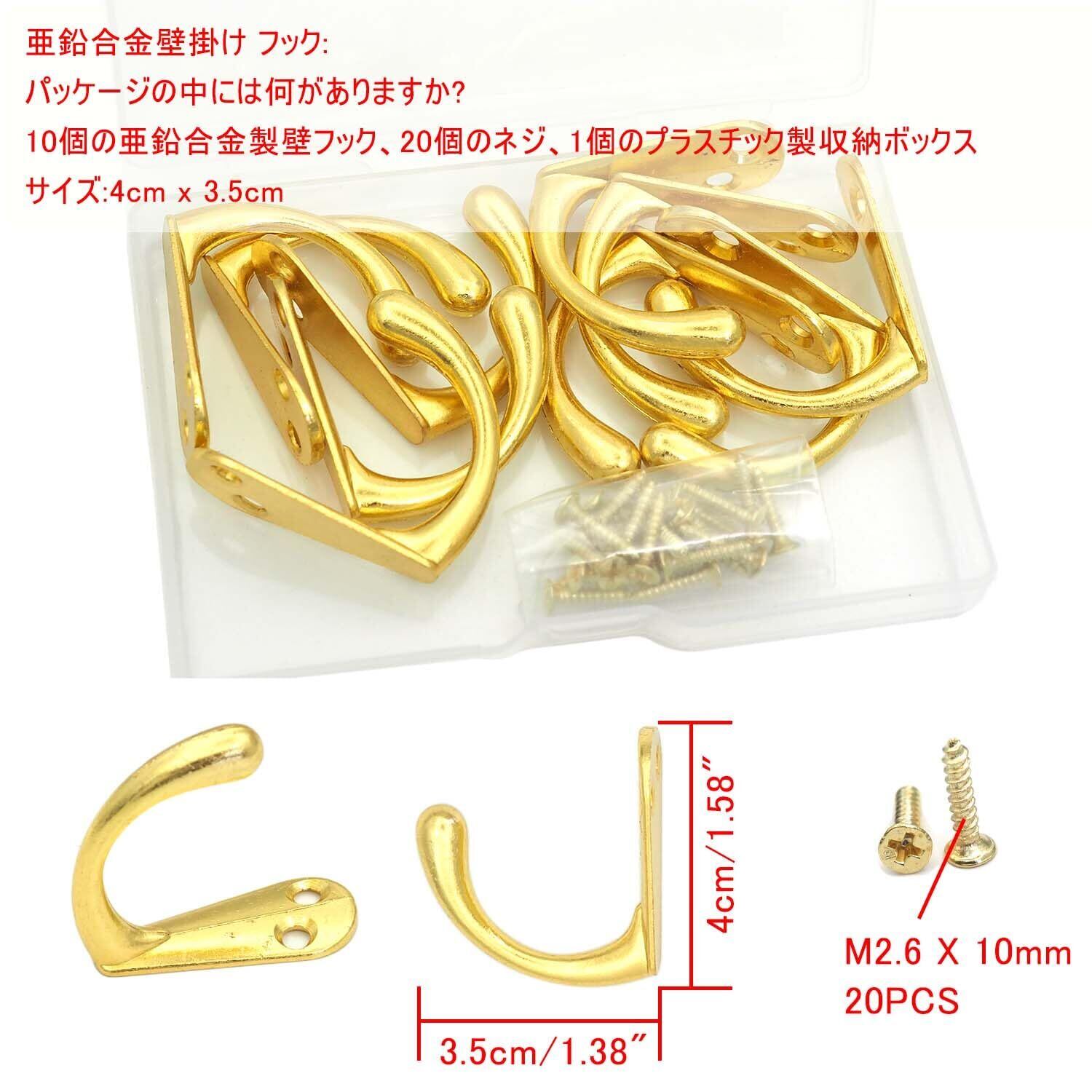 10個 亜鉛合金アンティーク 壁掛け フック 自己攻めネジで固定 高耐荷重 3kg 金具 かべかけフック キッチン 台所 壁かけ 洋服掛け (ゴールド)