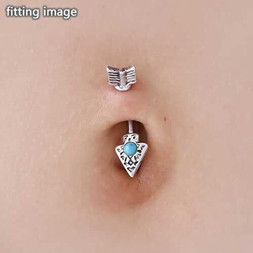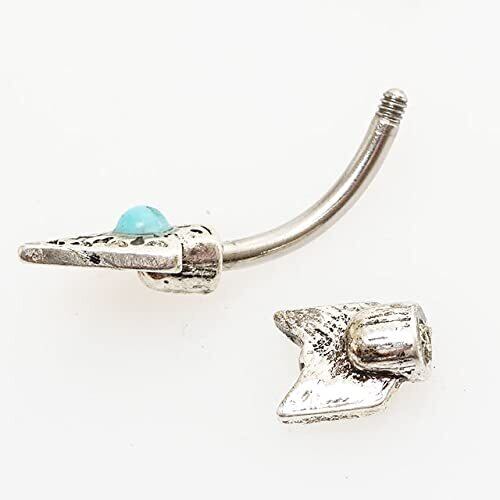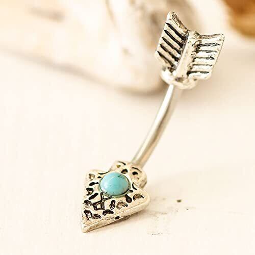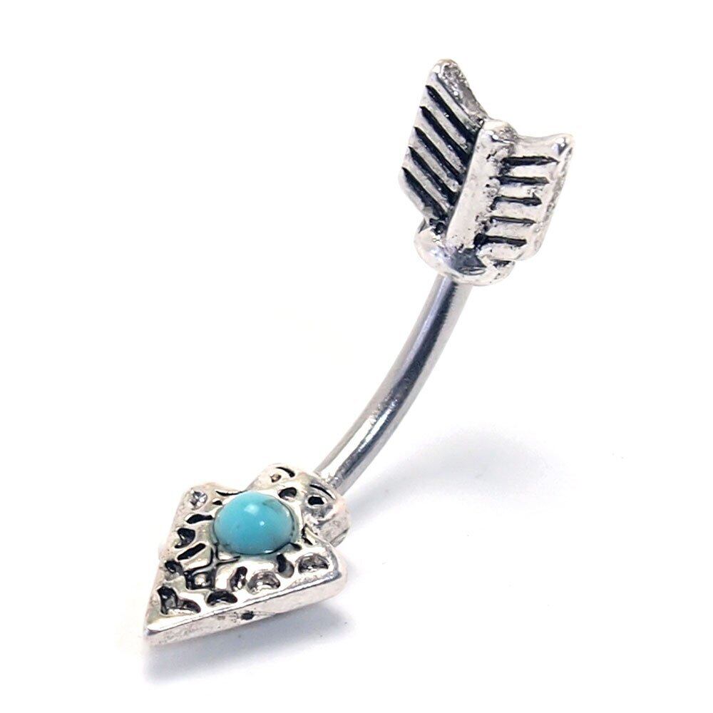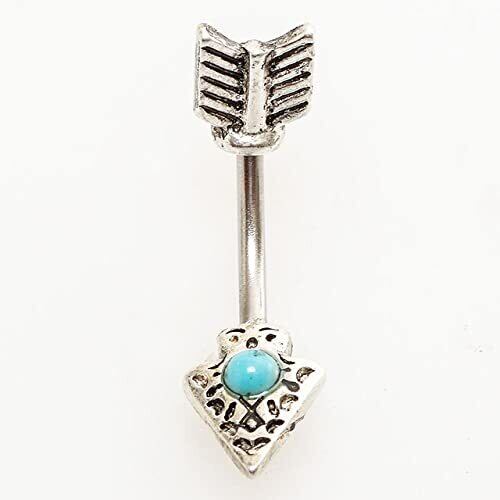 矢印をモチーフにした個性的でクールなヘソピアス(バナナバーベル)。 キャッチ部分とモチーフ部分を合わせて1つのデザインになっているのがお洒落。 センターにターコイズ風ストーンをセットし、シンプルだけど存在感もあるアイテム。 ユニセックス(男女兼用)で使えるので、ちょっとしたプレゼントにもおすすめです。