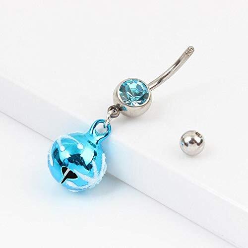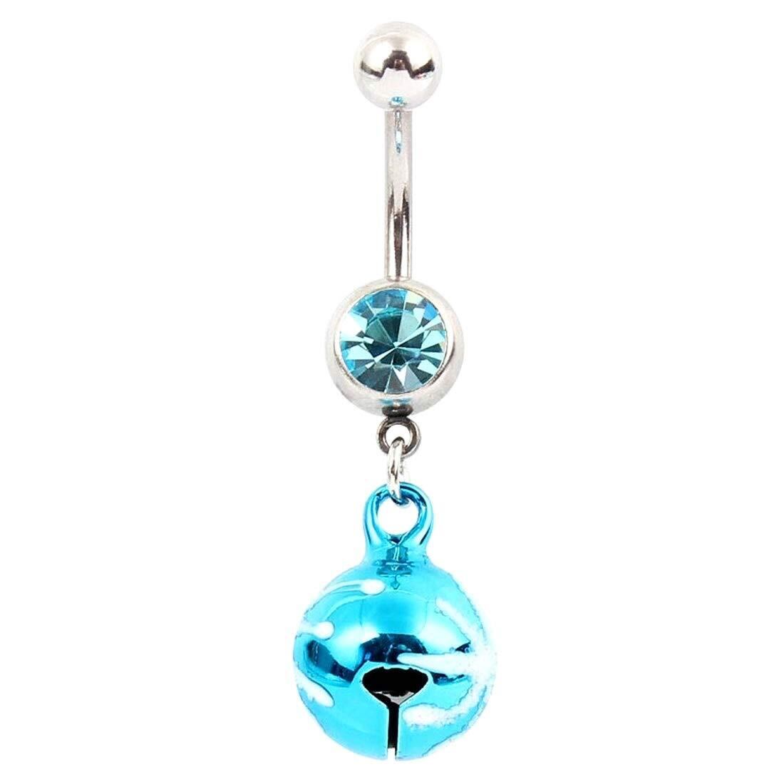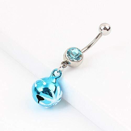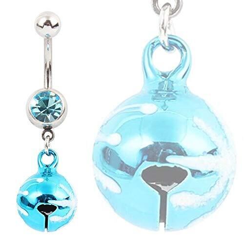 アクアブルーのキュービックジルコニアをセットした14ゲージのカーブバーベルのに大きな青色の鈴のチャームが揺れるおしゃれなヘソピアス型ボディピアス。シンプル綺麗なキュービックジルコニアの臍ピアスに大きな青色に白色の雪柄スノーのようなデザインのスズが存在感をアピールしてくれるボディピアス。 揺れるたびに綺麗な音色がリンリンなるおしゃれなへそピアスです。 男性からも女性からも人気のボディーピアス。 おへそのピアスとしてだけでなく耳に着けても綺麗なワッカのピアス。 メンズでもレディースでも使えるのでペアルックやプレゼントにもお奨めです。