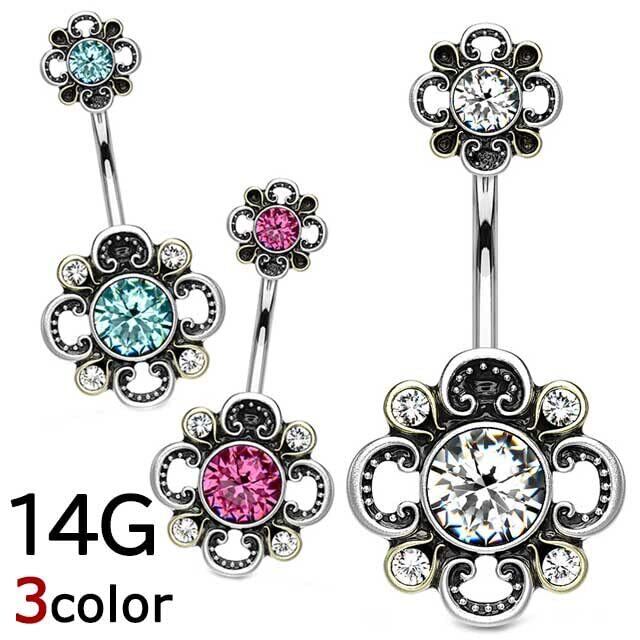 [HSP] へそピアス 14G ラウンドCZ フローラルフィリグリー バナナバーベル ボディピアス サージカル ステンレス アクアマリン