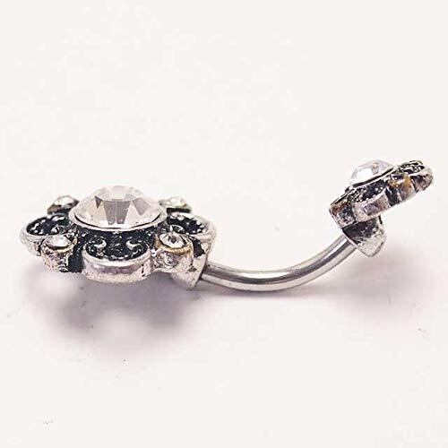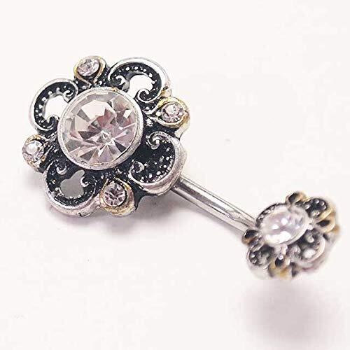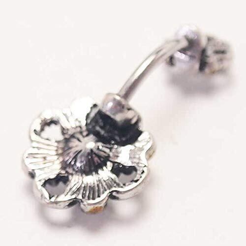 【人気のチャーム付きボディピ】ビンテージ風のお花が可愛いヘソピアス。真ん中にキラリと光るキュービックジルコニアがお洒落です。ボタン風のフラワーは固定タイプで使いやすく、デイリー使いにもおすすめ。人気のバナナバーベルです。