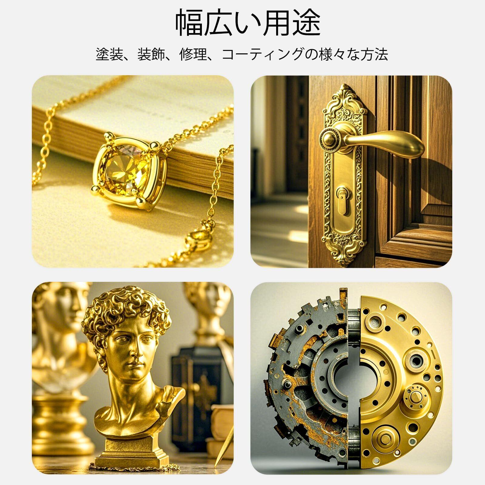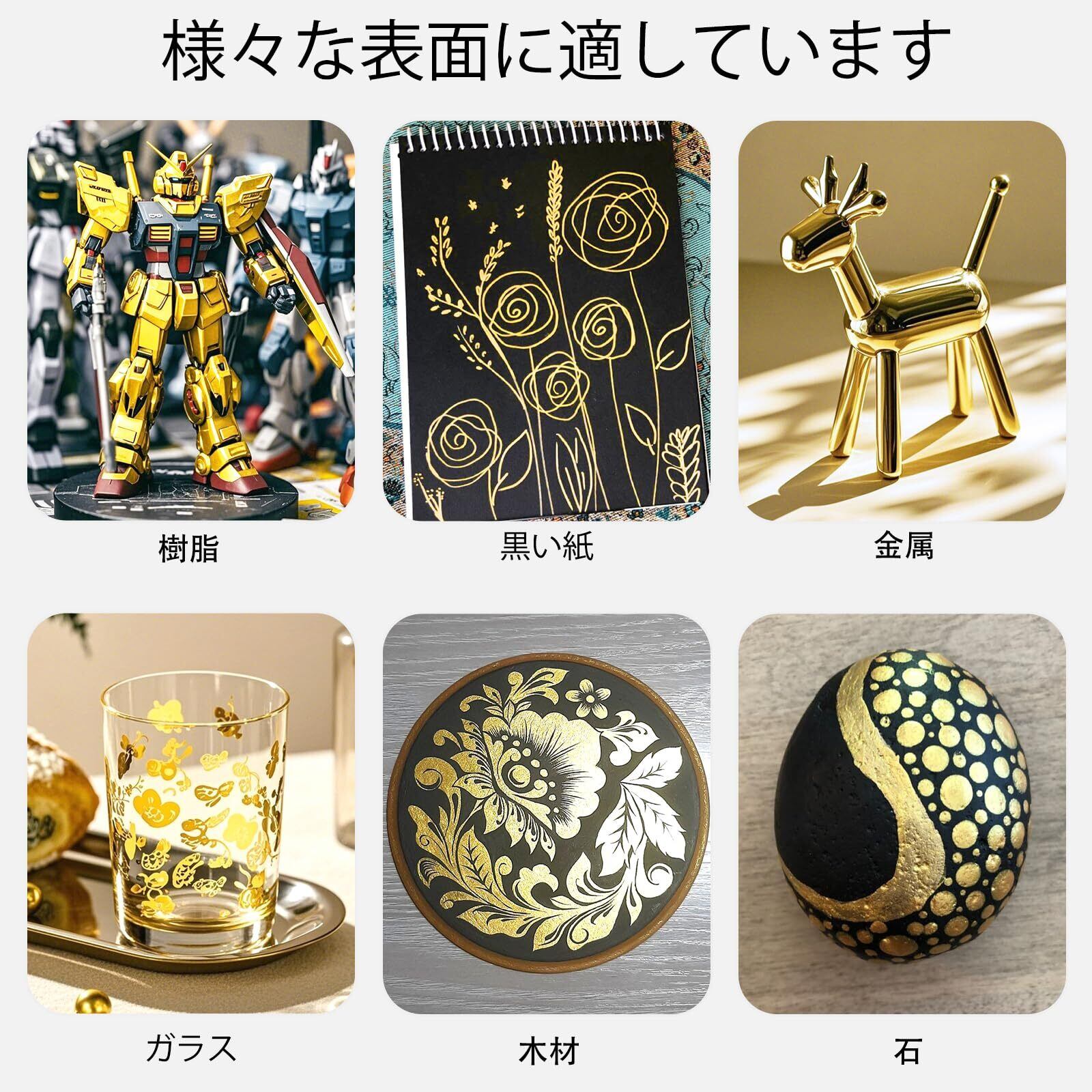 様々な用途:メッキ補修ペンは、レジン、金属、ガラス、セラミック、木材、紙、模型など、幅広い素材に対応します。金属光沢コーティング修復、クリスマスレジン細工、ジュエリー修復、DIYクラフト、インテリアなど、多様な用途で活躍します。卓越した発色と接着力で、日用品を劇的に変身させられます