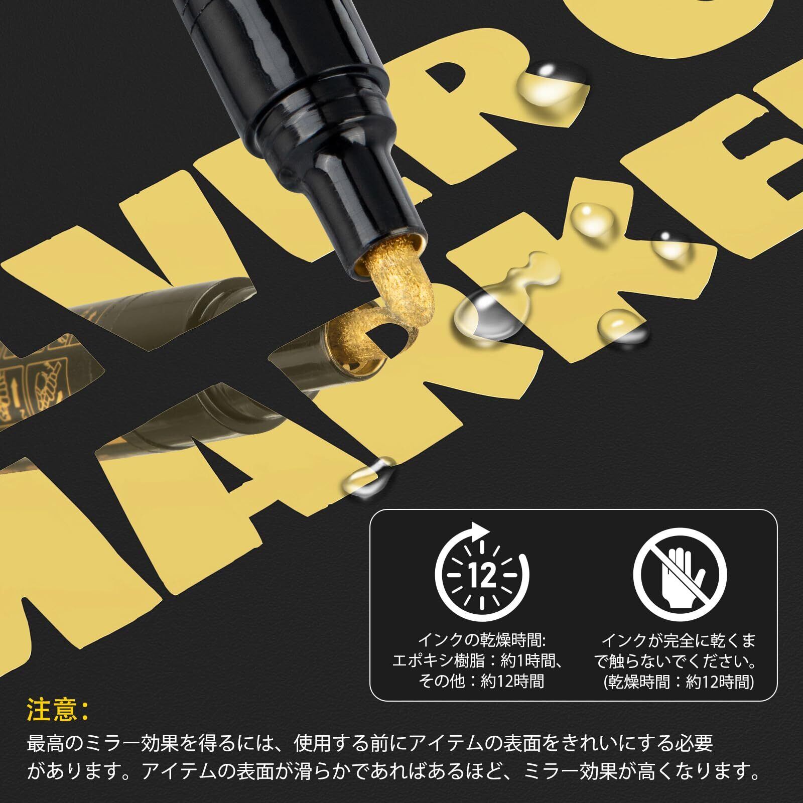 金属鏡面効果: AKARUED メタルメッキペンは、高品質で鏡面レベルの光沢を発する特殊配合インクを使用しています。高い不透明度と優れたUVカット性能を持ち、鏡のような驚くべき光沢を実現します。インクは乾燥後に優れた防水性を発揮し、長期的な色の鮮やかさを保ちます