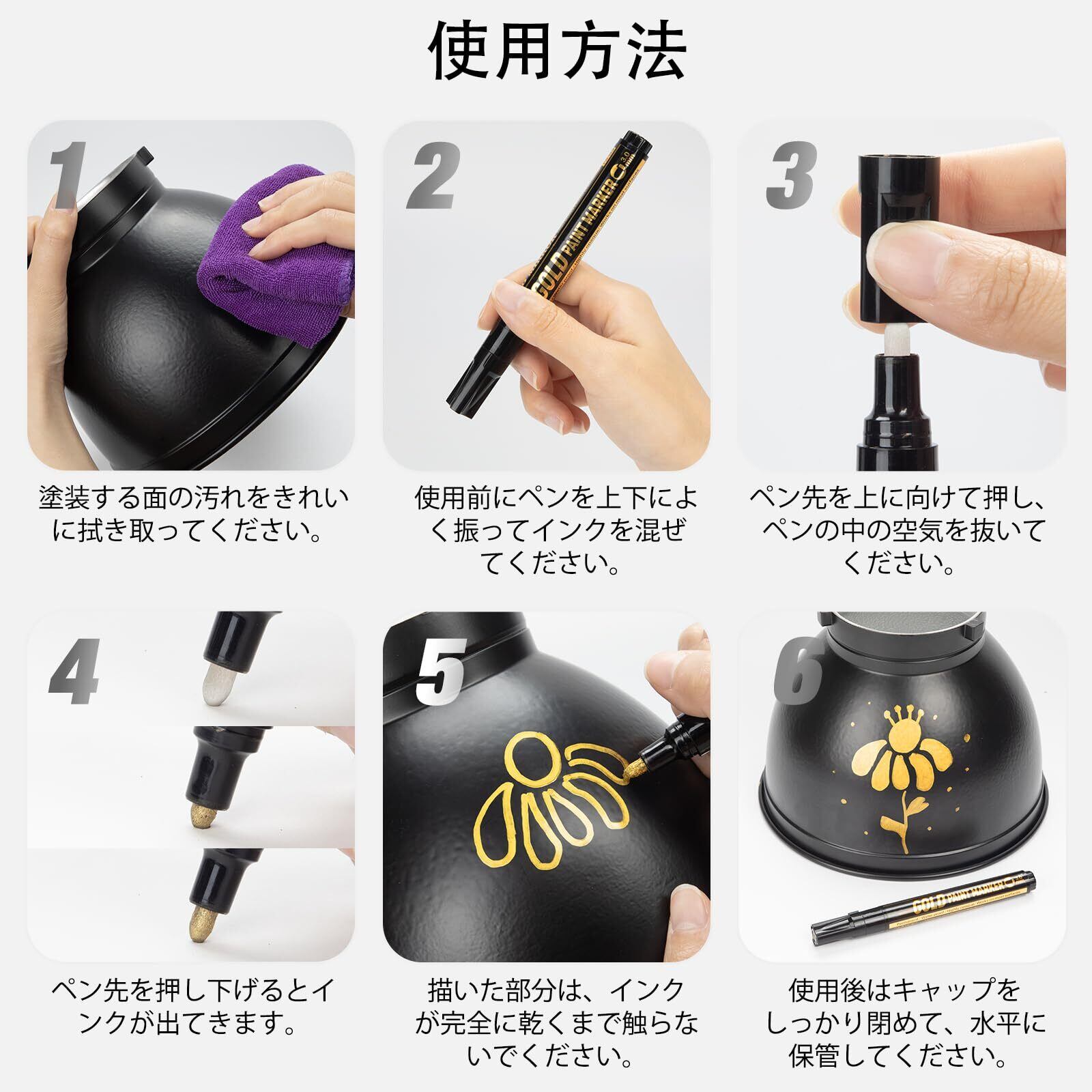 パーマネントな耐久性: この高品質なメタリックマーカーは、長持ちするインクを採用しています。ほとんどの素材でハイグロスな仕上がりが得られ、光沢感と輝きが持続します。高濃度の顔料配合でUVカット効果も高く、傷や磨耗にも強いため、長期的な美しさを保証します