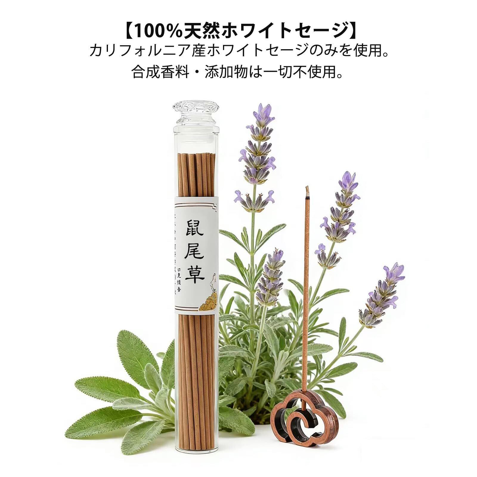 天然ホワイトセージを贅沢に使用した線香タイプです。 1本約10cm、約20本入り。人工香料・添加物は一切不使用で、ホワイトセージ本来の清らかな香りをお楽しみいただけます。 瓶入りで湿気を防ぎ、保存にも便利。シンプルでスタイリッシュな見た目はご自宅用だけでなくギフトにも最適です。 さらに、すぐにご使用いただけるよう専用香立ても付属。ヨガや瞑想、リラックス空間づくり、パワーストーンの浄化など幅広くご利用いただけます。