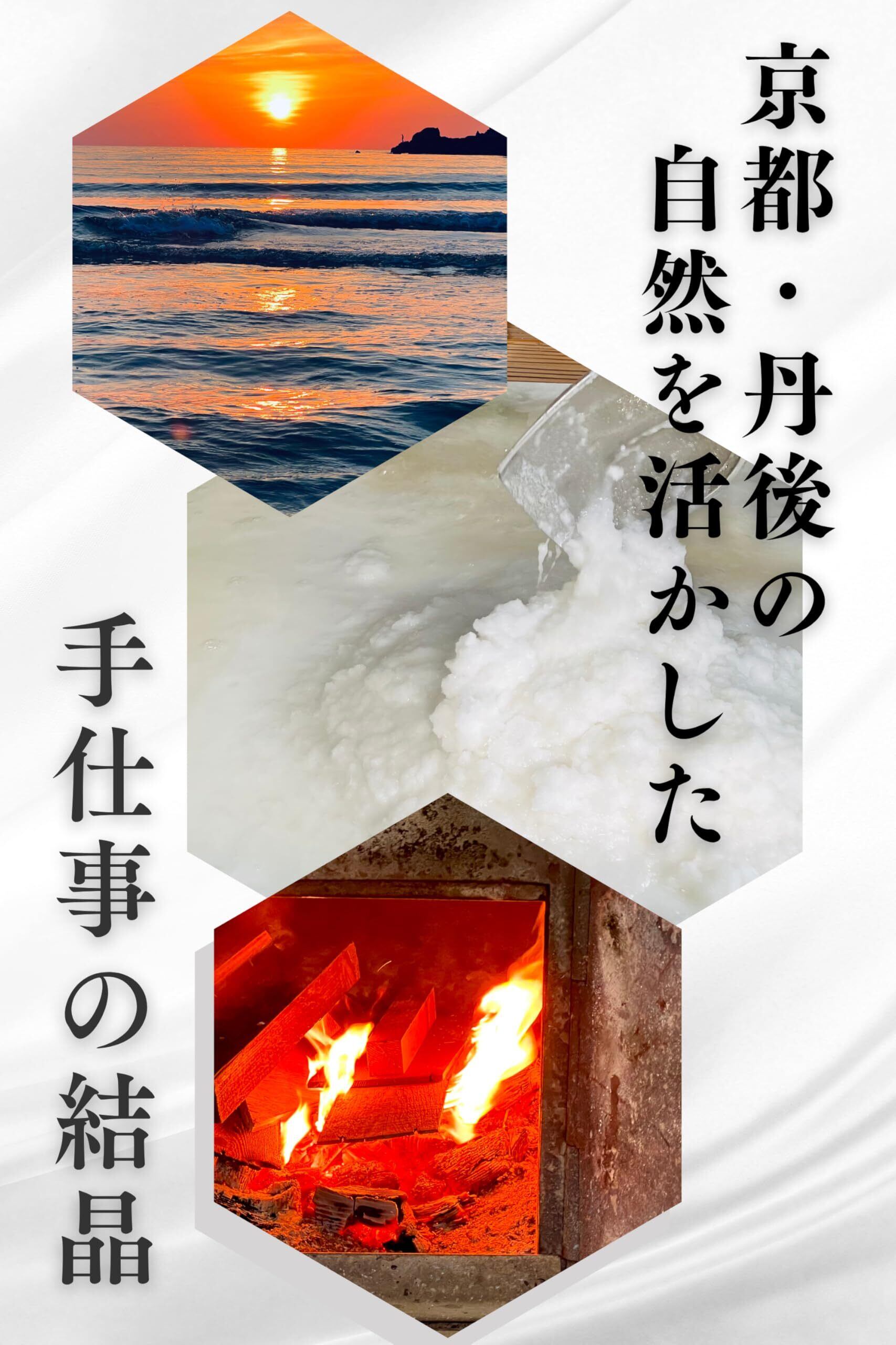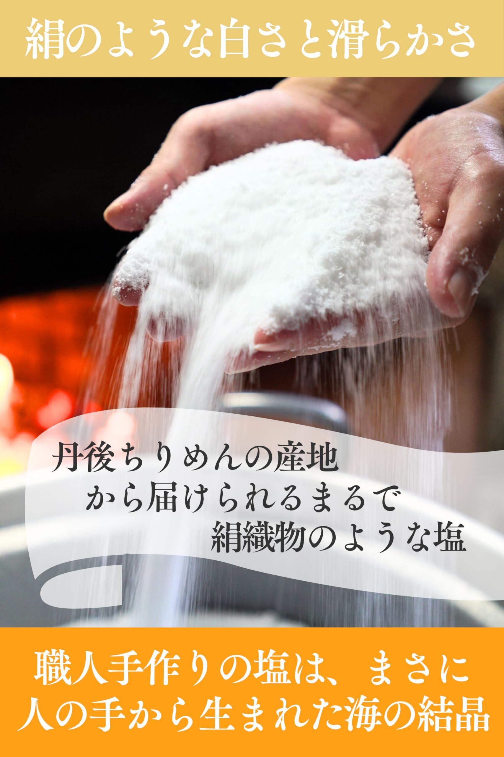 【絹織物のような滑らかさ】この自然塩の生産地である丹後地方は、高い品質で知られる絹織物『丹後ちりめん』の産地でもあります。この海塩も職人が丁寧に不純物を取り除くことによって、実現された絹のような白さと見た目にも美しい天然塩( しお、自然塩 )です。