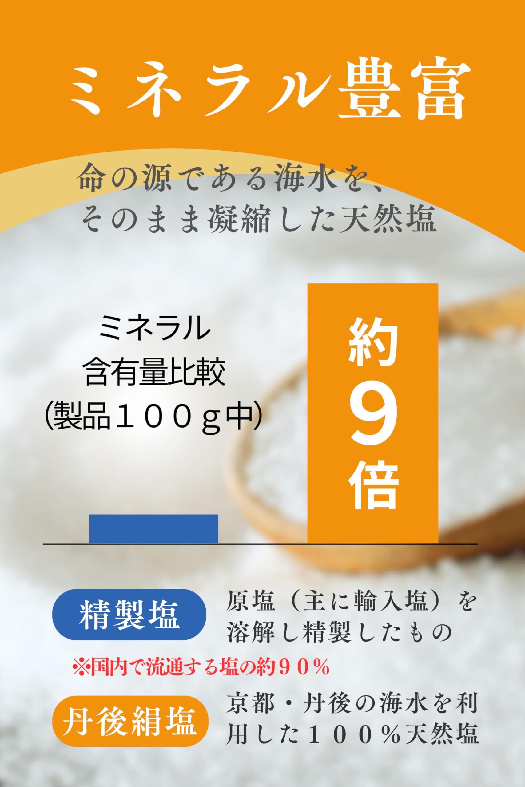【豊富なミネラルの天然のお塩】柔らかな舌触り、まろやかな甘み、これらは精製された塩( しお、食塩)では中々味わうことが出来ません。丹後絹塩はミネラルを豊富に含んでいることによって、しょっぱさだけではない深い旨みを持った天然の粗塩(自然塩)です。※ 天日海塩ではありません。
