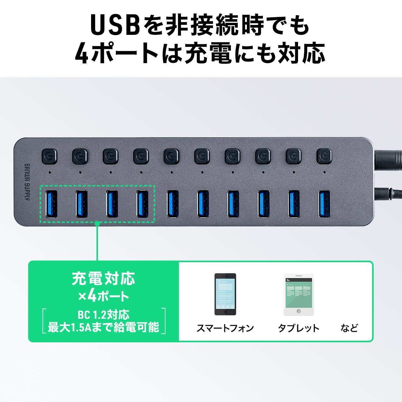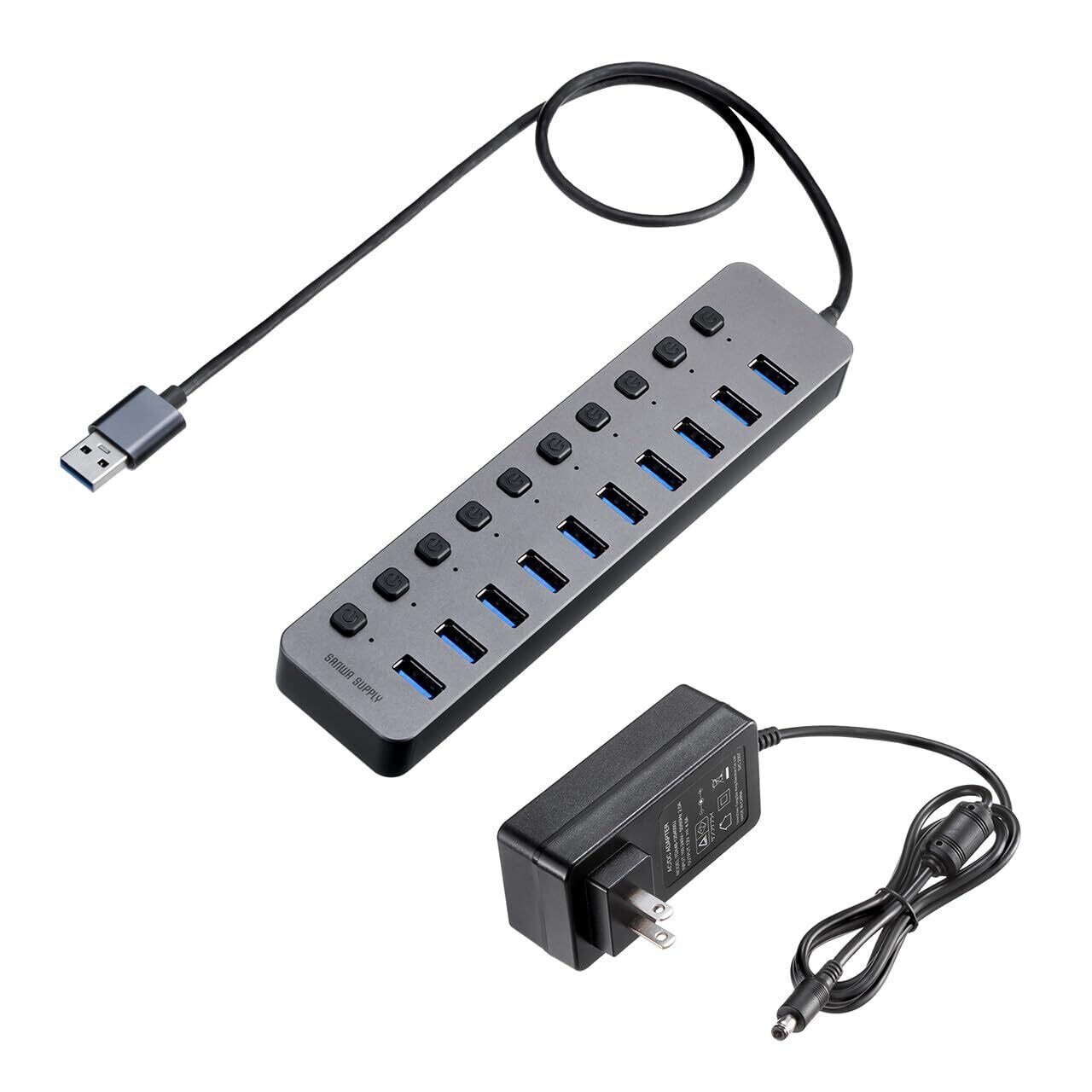 サンワダイレクト USBハブ 10ポート セルフパワー USB充電器 個別スイッチ付 USB3.2/5Gbps ACアダプタ付 400-HUBA23GM