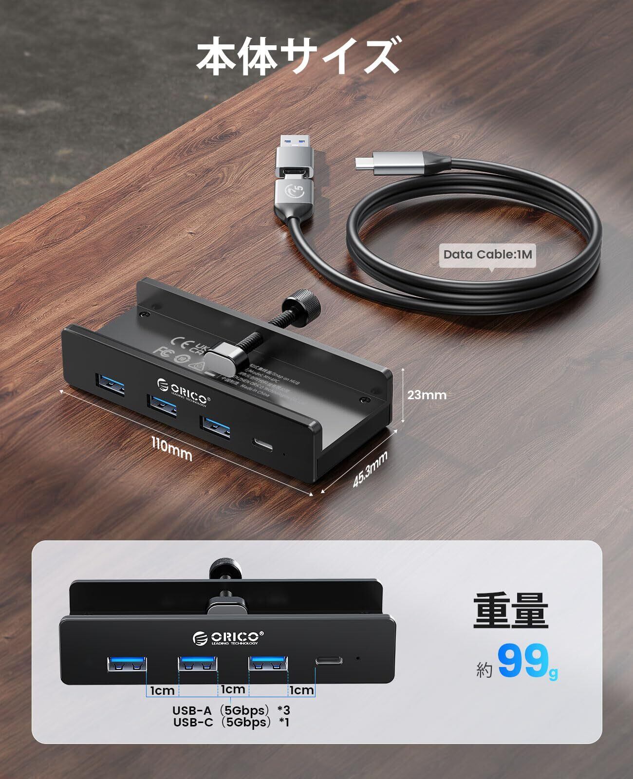 ORICO USB C ハブ クランプ 固定 usb hub 3.0 4ポート 5Gbps高速転送 USB-C 給電ポート付き(5V/3A) バスパワー/セルフパワー両対応 2-IN-1 1mケーブル付き アルミ クリップ式 USB拡張 USB増設 Windows/Linux/Mac OS対応 テレワー 在宅勤務 ブラック MH4PC