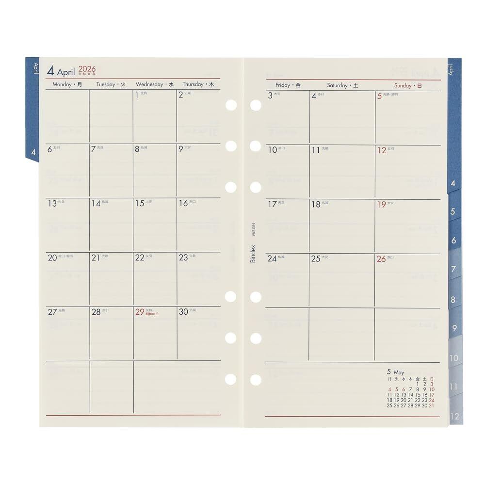 能率手帳の会社がつくるシステム手帳ブランドBindex by NOLTY (バインデックス バイ ノルティ)のリフィル(バイブルサイズ)。月別インデックス付。