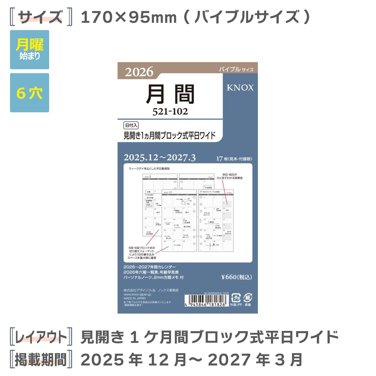 ノックス システム手帳 リフィル 2026年 バイブル マンスリー 月間ブロック平日ワイド 52110226 (2025年12月始まり)