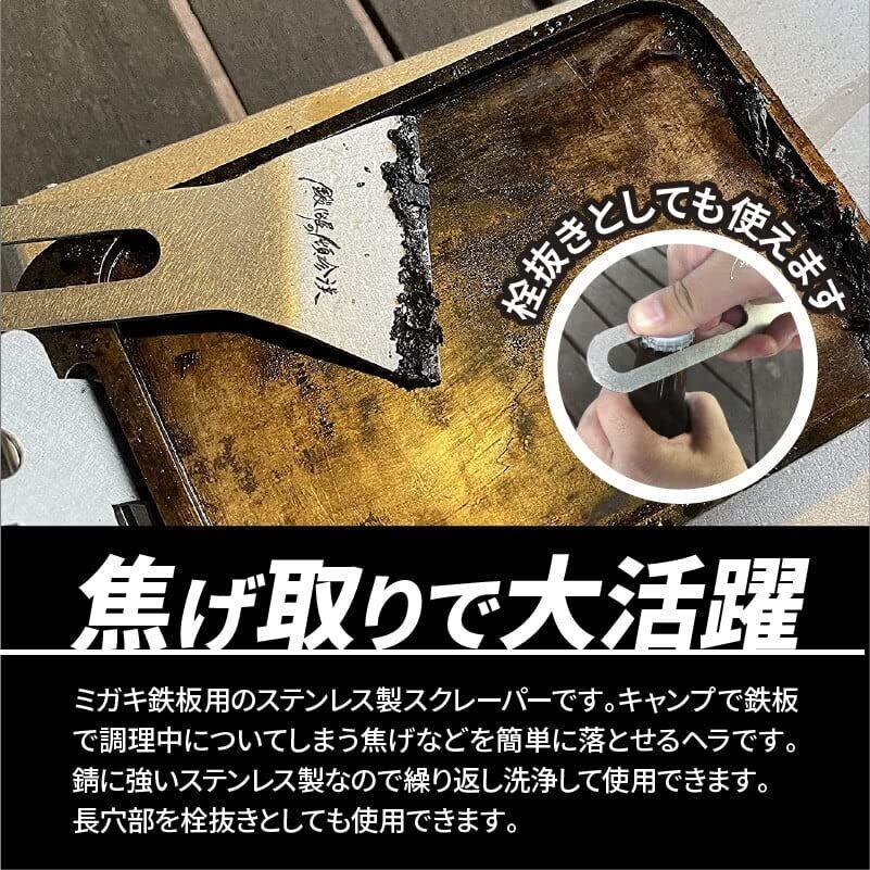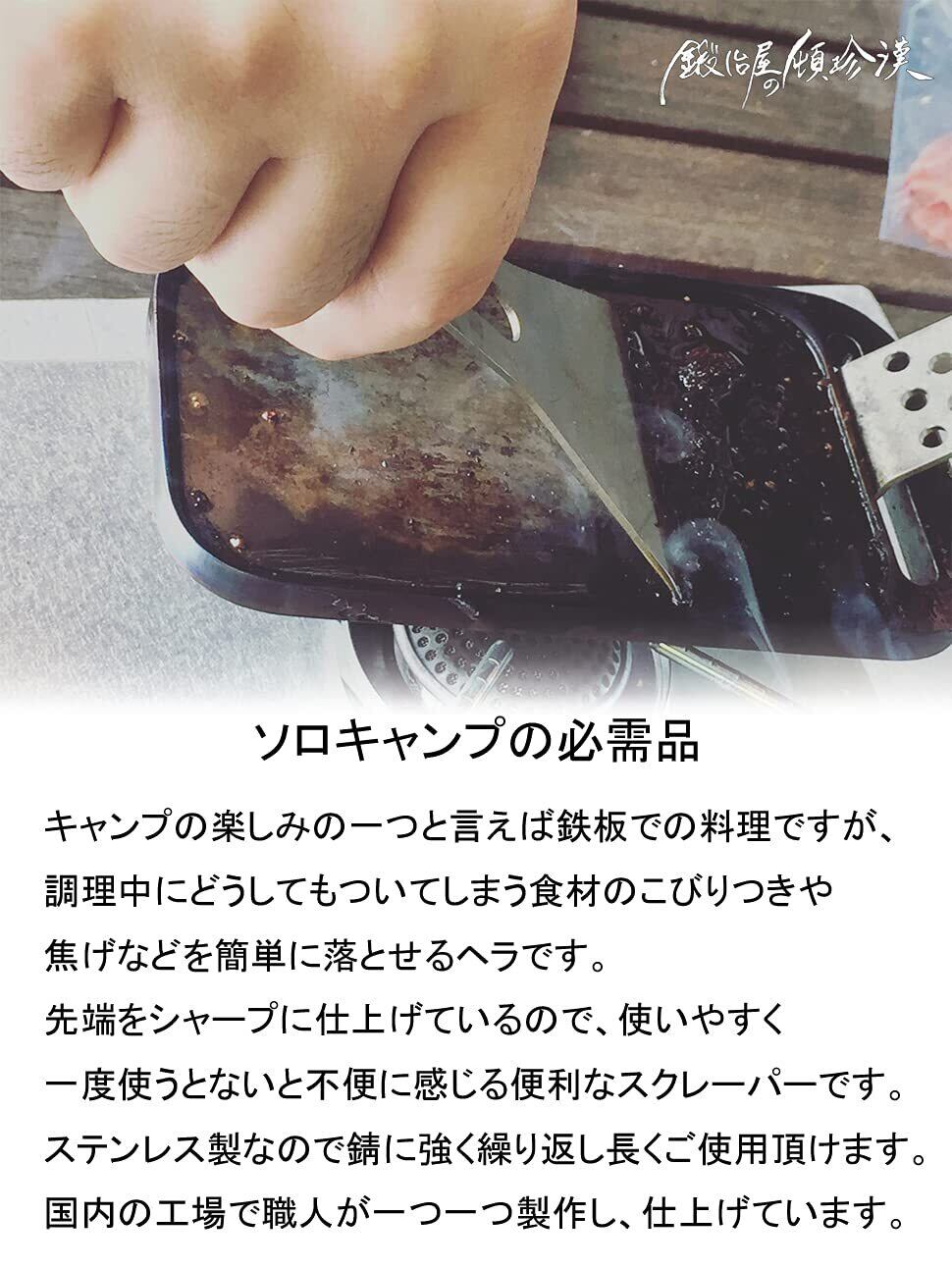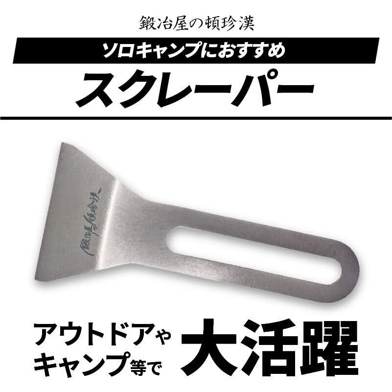 鍛冶屋の頓珍漢 ミガキ鉄板用のステンレス製スクレーパーです。キャンプで鉄板で調理中についてしまう焦げなどを簡単に落とせるヘラです。一度使うとないと不便に感じる便利なキャンプ用焦げ落としスクレーパーです。