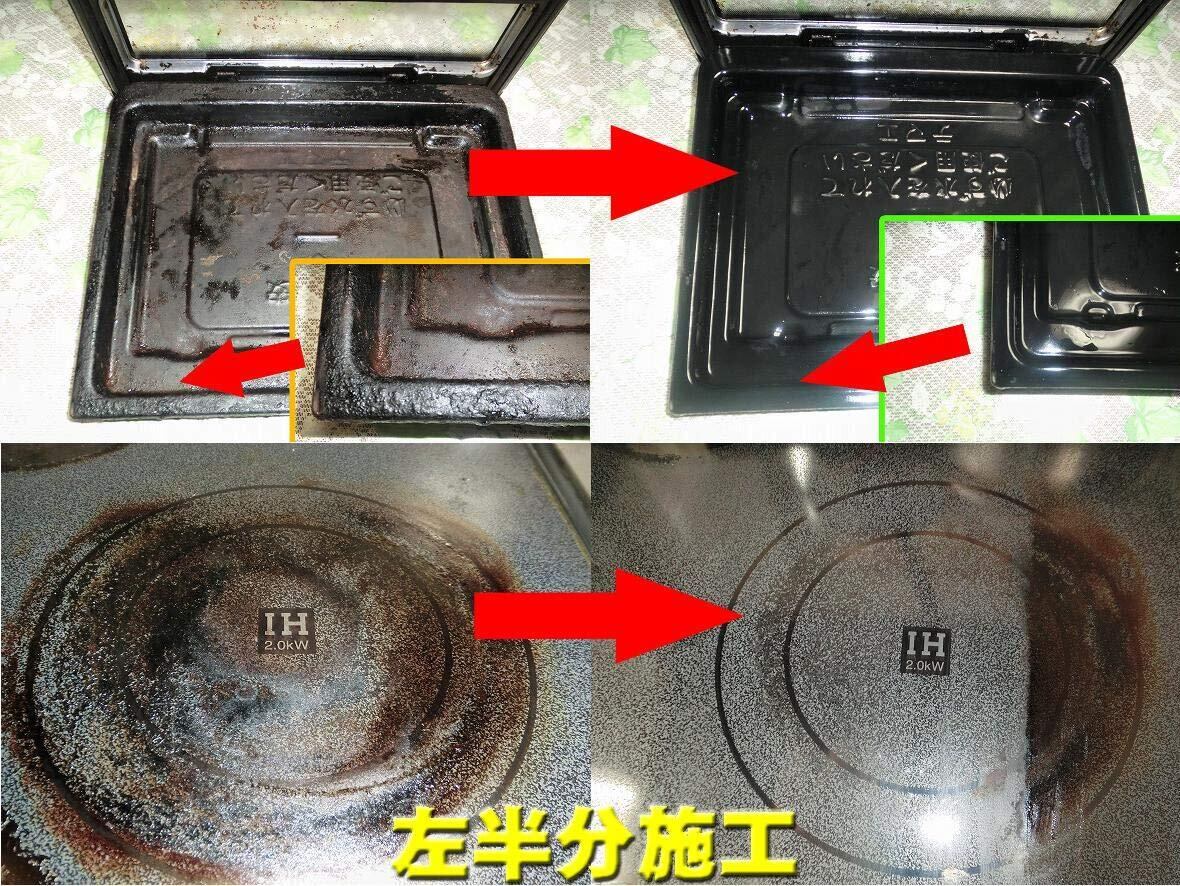 キッチンや厨房にある【炭化した油汚れ(焦げ)】をどのように洗浄していますか? 研磨剤や金たわし・ケレンいったもので擦ると傷が付くだけでなく焦げや汚れが再付着しやすくなってしまいます。劇物や有機溶剤に付けておくと満足に取れないだけでなく塗装を剥がしたり素材そのものを痛めてしまう恐れがあります。 【こげとりぱっとビカ】は簡単に【焦げ付き】を落とす事が出来る毒物劇物取締法及び有機溶剤中毒予防規則に非該当な洗浄剤です。また研磨剤を含んでいないので光沢を落とす心配がありません。 ※アルミ製品・樹脂加工品には使用出来ません。 ※作業時間:1~6時間程度、固着している場合は24時間程度ラップ等で乾かないようにシップして下さい。その後洗浄剤のハネ、飛び散りに注意してナイロンブラシまたはプラスチック製のヘラでこすり落としてください。