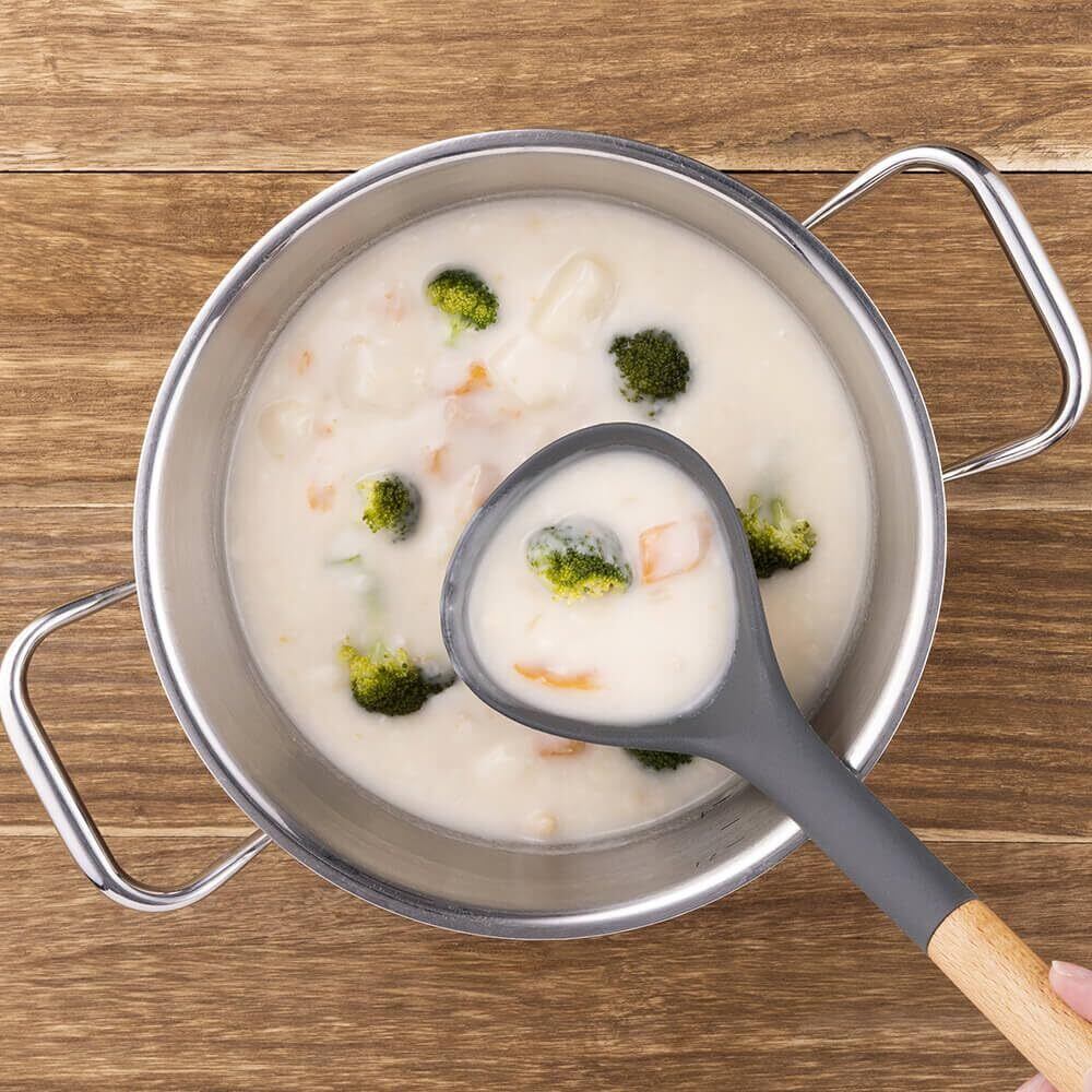 鍋を傷つけにくいシリコーン素材と手になじむ天然木ハンドルのkiriconシリーズ。