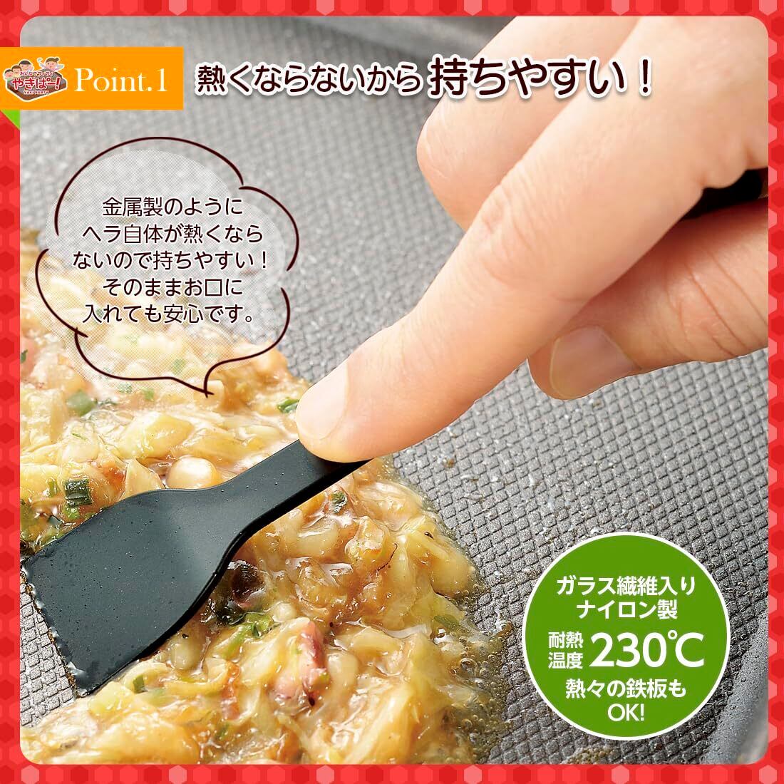 ふっ素樹脂加工のホットプレートも傷つけにくい、ナイロン製のもんじゃヘラです。