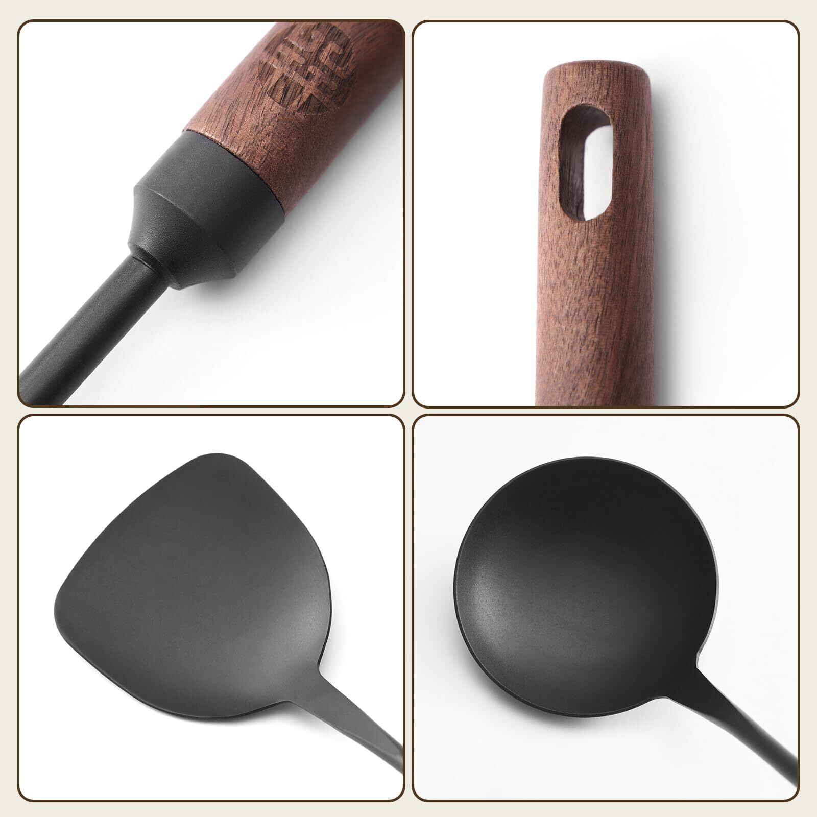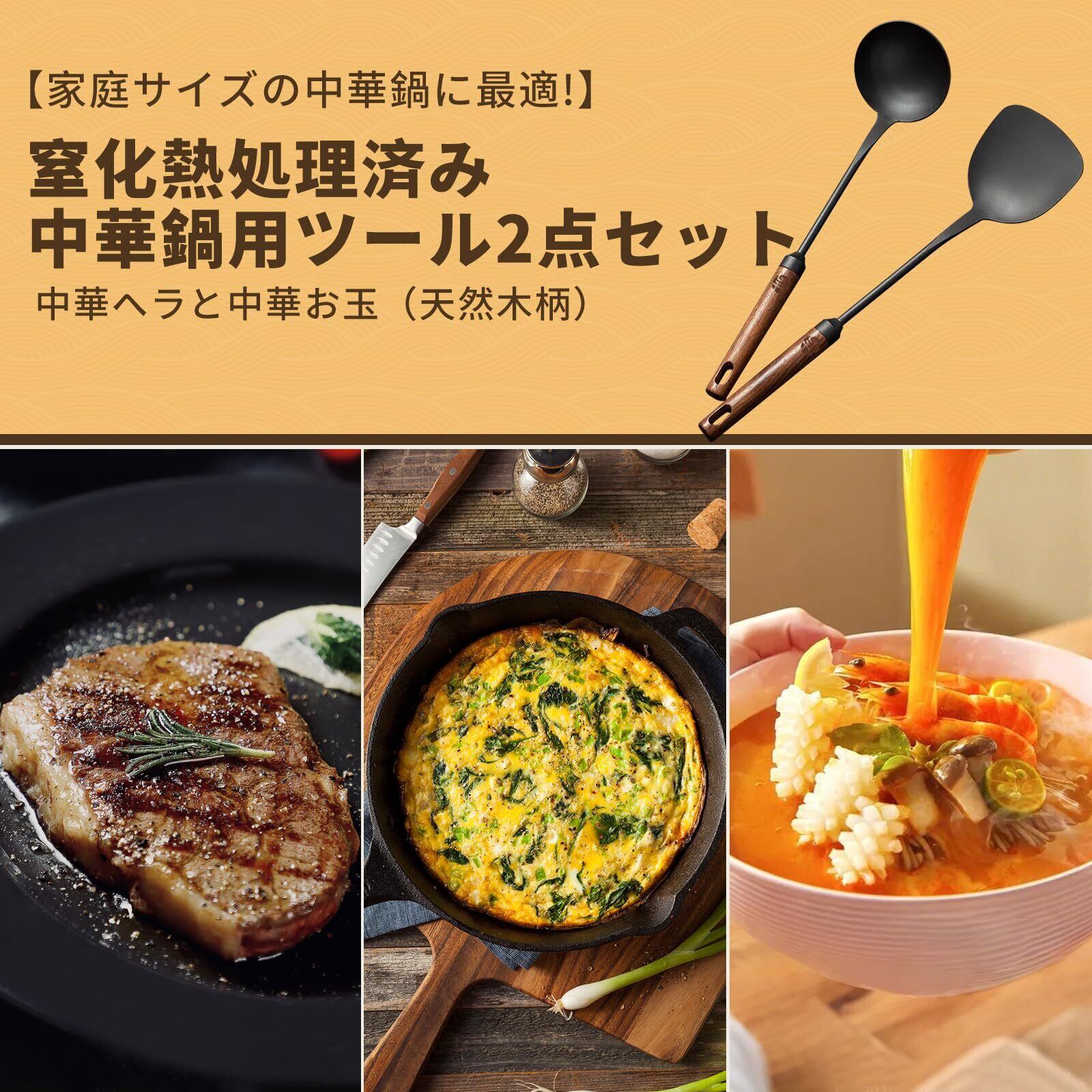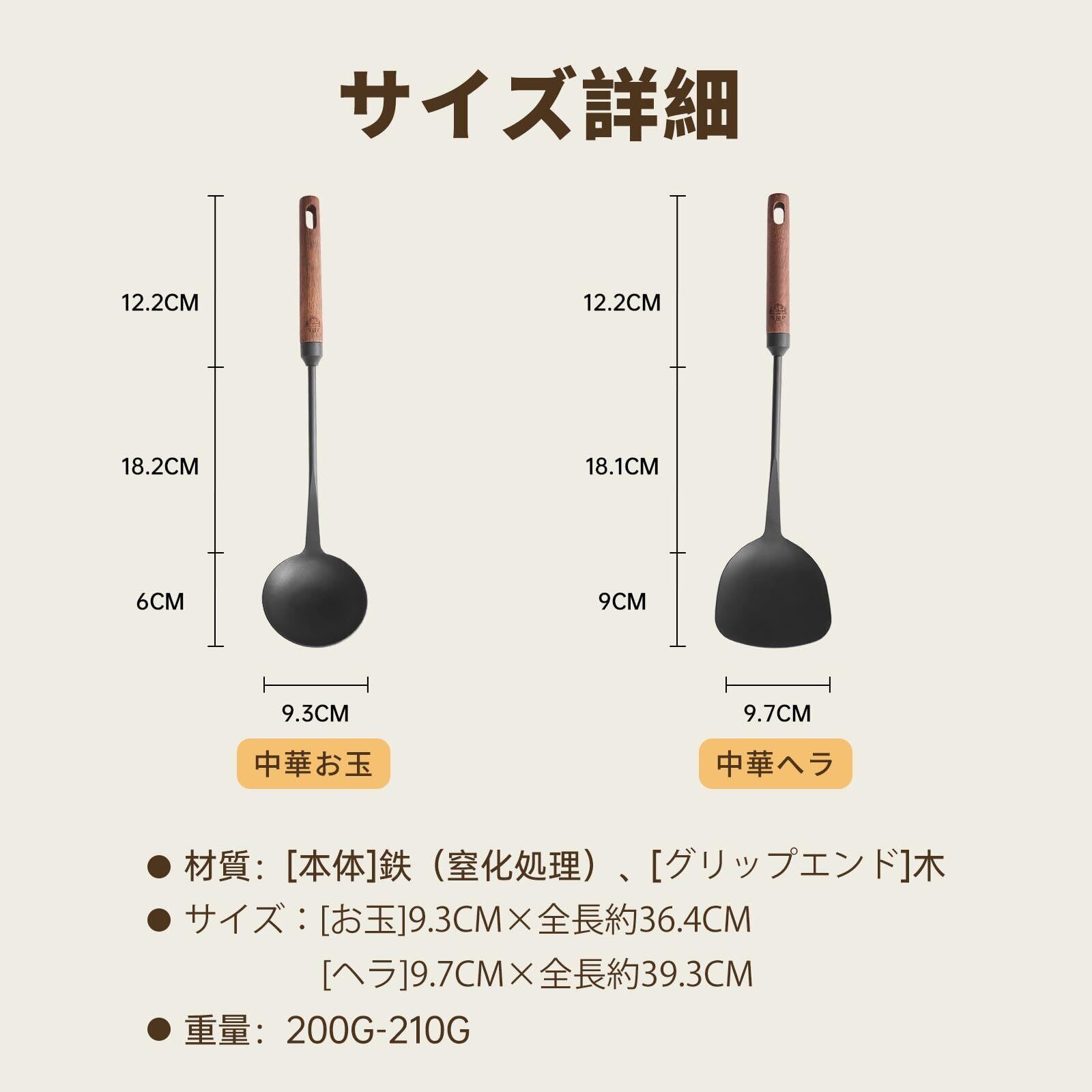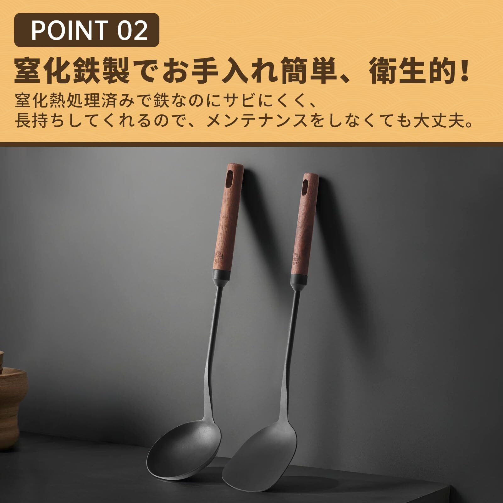 WANGYUANJI 中華スパチュラ へら おたま 窒化鉄製 中華鍋鉄製フライパン専用お玉ヘラセット 天然木ハンドル 穴有り 収納便利 取扱やすい ヤケド防止 握りやすい 返し スープ チャーハン 業務用 キッチンツール