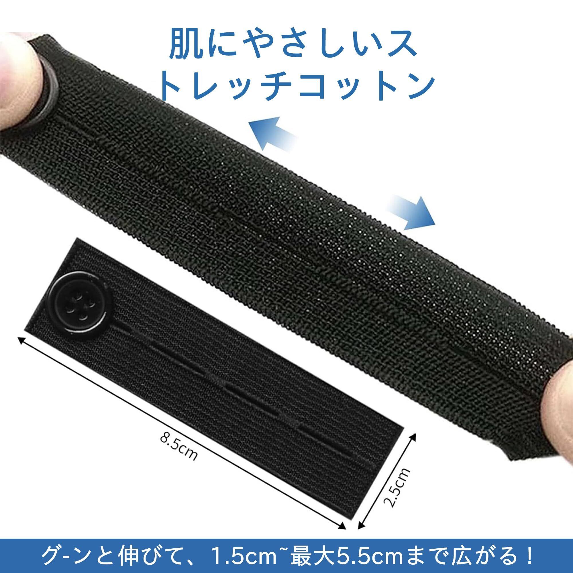 【商品内容】 ブラックのウエスト延長バンド×2個セット。サイズ:約8.5cm×2.5cm、ボタン直径:約1.5cm。縫製・工具不要、誰でも簡単にウエストを拡張できる便利アイテムです。お気に入りのパンツをもっと快適にフィットさせることができます。