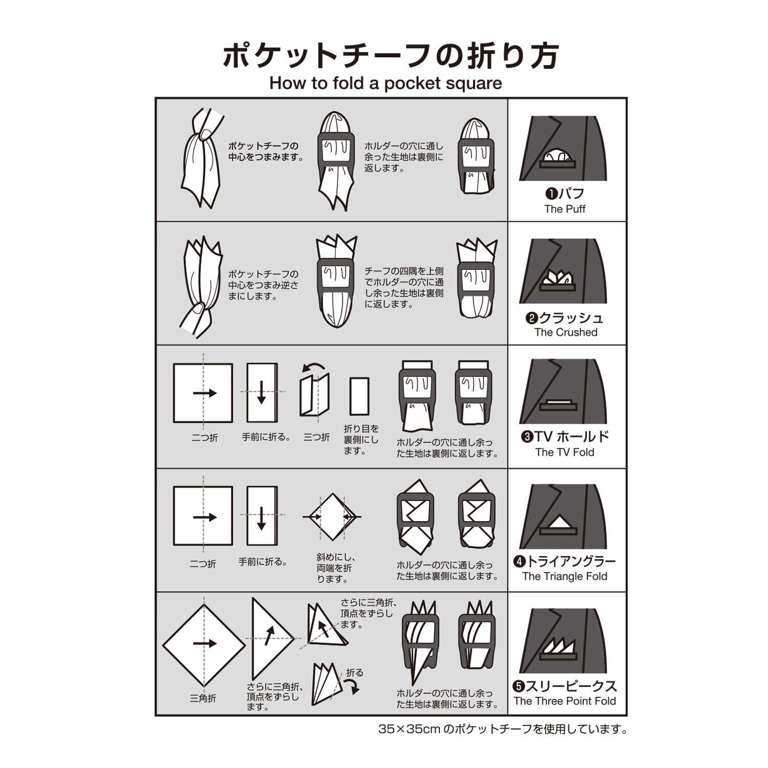 【ポケットチーフの折り方】折り方説明書付(1)パフ(2)クラッシュ(3)TVホールド(4)トライアングラー(5)スリーピークス