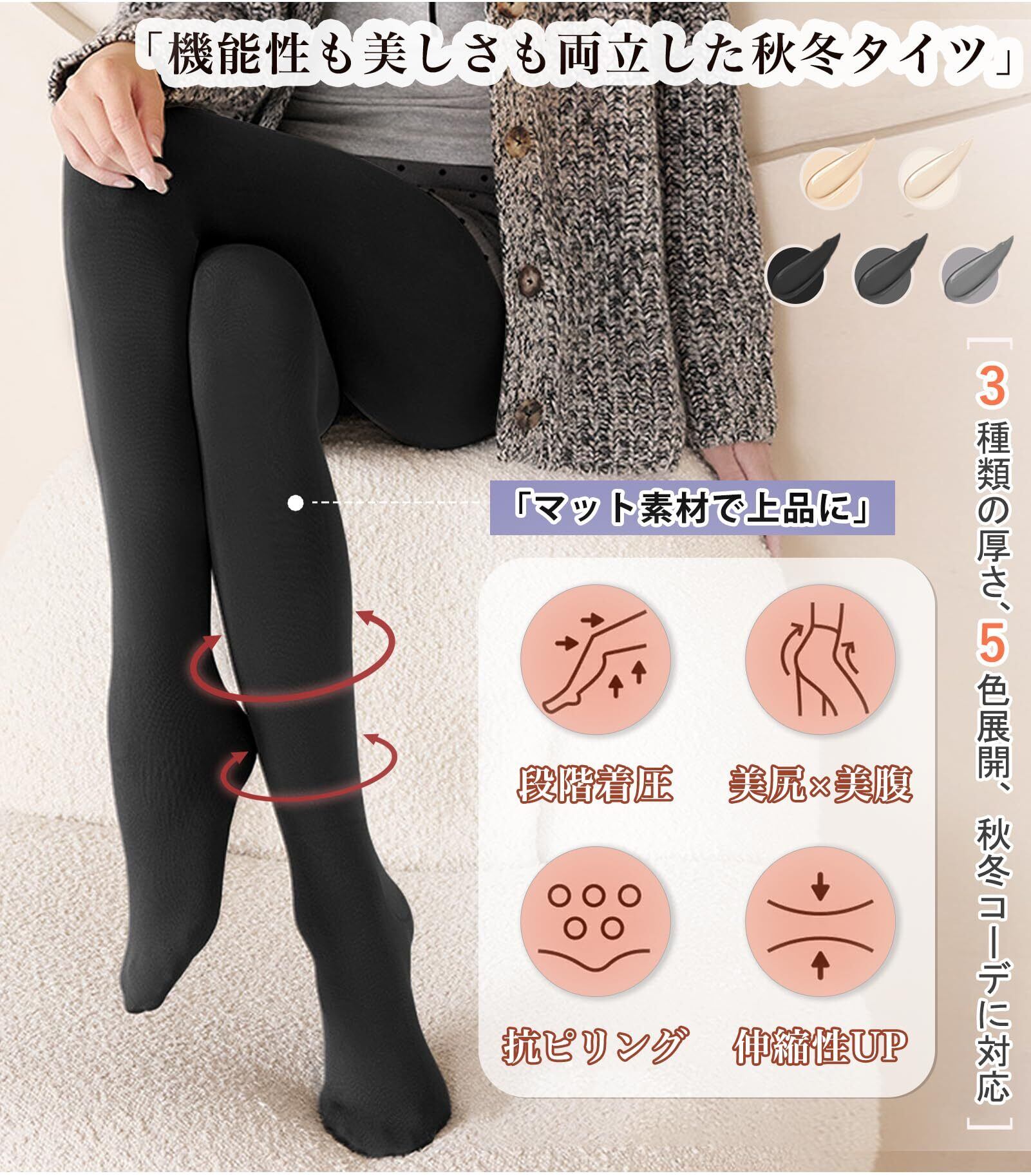 【機能性 × 美しさを両立した秋冬タイツ】秋冬コーデに欠かせない美脚タイツ。80D・200D・480Dの3タイプと、選べる5カラー展開で寒暖差にも対応。段階着圧設計(足首23hPa / 太もも14hPa)で、引き締めながら美尻・美腹シルエットを叶えます。抗ピリング加工(毛玉防止テスト最高レベル4-5級達成)で毛玉ができにくく、長く美しい状態をキープ。