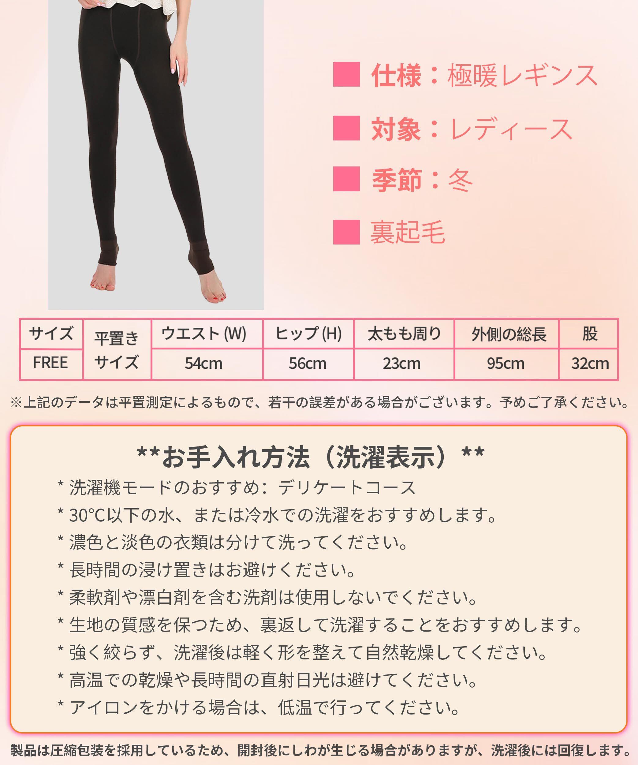 **衣類のお手入れ方法(洗濯表示)** * 洗濯機モードのおすすめ:デリケートコース * 30℃以下の水、または冷水での洗濯をおすすめします。 * 濃色と淡色の衣類は分けて洗ってください。 * 長時間の浸け置きはお避けください。 * 柔軟剤や漂白剤を含む洗剤は使用しないでください。 * 生地の質感を保つため、裏返して洗濯することをおすすめします。 * 強く絞らず、洗濯後は軽く形を整えて自然乾燥してください。 * 高温での乾燥や長時間の直射日光は避けてください。 * アイロンをかける場合は、低温で行ってください。 裏起毛 レギンス1200デニールという超厚手生地に、ふわふわモコモコの極厚裏起毛を採用。外気をシャットアウトし、体温を逃さない断熱層を形成。-30℃ という厳寒環境下でも、足元からしっかり温もりをキープ。暖かいレギンスは北国や山岳地帯でのアウトドアはもちろん、冷え性の方や真冬の通勤・通学、寒いオフィスでも、究極の暖かさを実現するレギンス裏起毛トレンカです。