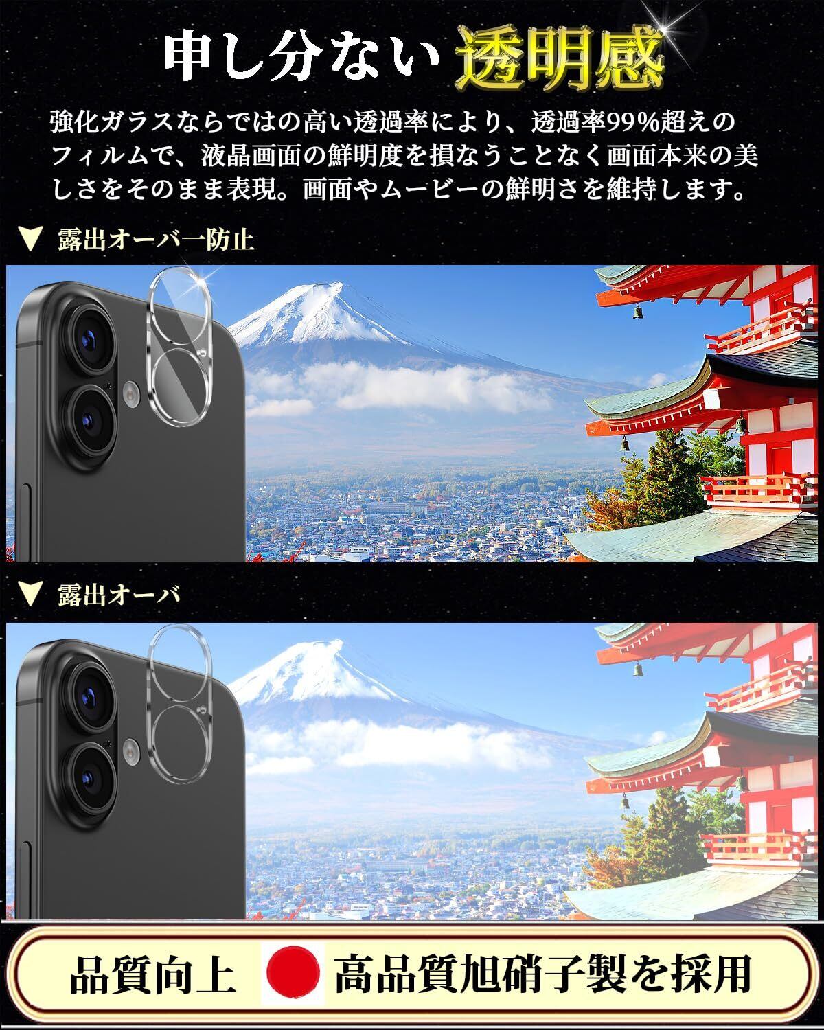 【旭硝子素材採用!対応機種】iPhone 17 カメラフィルム一般的な液晶保護フィルムの約6倍の強度。衝撃は強化ガラスに吸収されますので、ディスプレイにかかる衝撃負荷を軽減し。ディスプレイが破損することを防ぎます。万が一の破損時も飛散防止加工によって破片はフィルムに張り付いた状態で破片がほとんど飛び散らない安全性の高いガラスになっています。