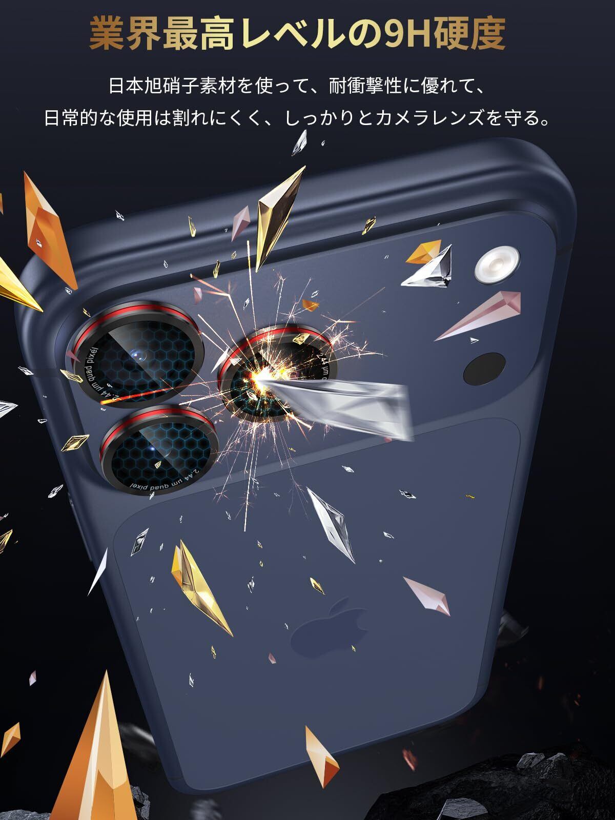 【耐衝撃・保護力満点】最高硬度9Hの強化ガラスと耐摩耗性に優れた航空用アルミ合金を組み合わせたカメラカバーは、衝撃を効果的に吸収し、レンズをしっかり守ります。鍵やカッターなどの鋭利なものが当たっても傷つきにくく、日常使いでも安心です。さらに、万が一ガラスが割れても破片が飛び散らない飛散防止仕様で、安全性も抜群。