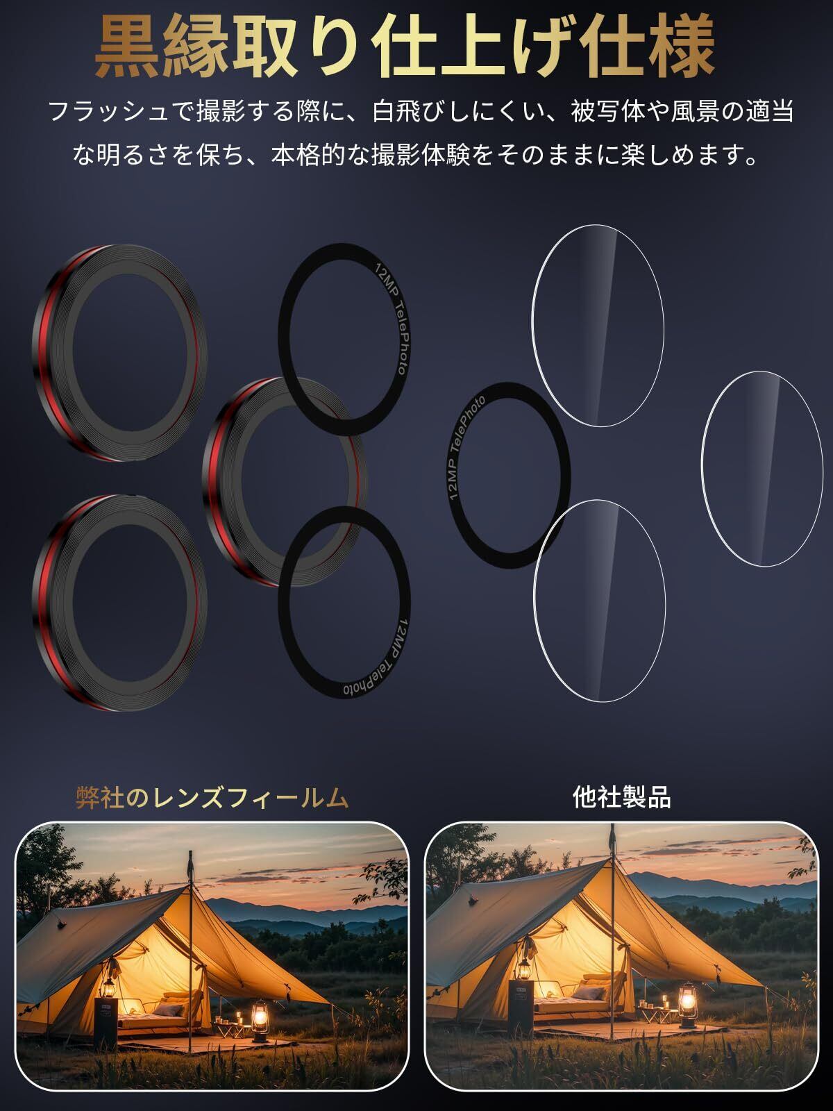【露出オーバー防止・超高透過率】フラッシュ撮影時の光の乱反射による白飛びを防ぐため、黒縁デザインを採用し、写真が白っぽくなる現象を効果的に軽減します。さらに、レンズ表面には光学ARコーティングが施されており、光の透過率は99.9%を実現。あらゆる環境でiPhone本来の高画質を楽しめます。プロのような映像表現で、魅力的な画像や動画を記録できます。