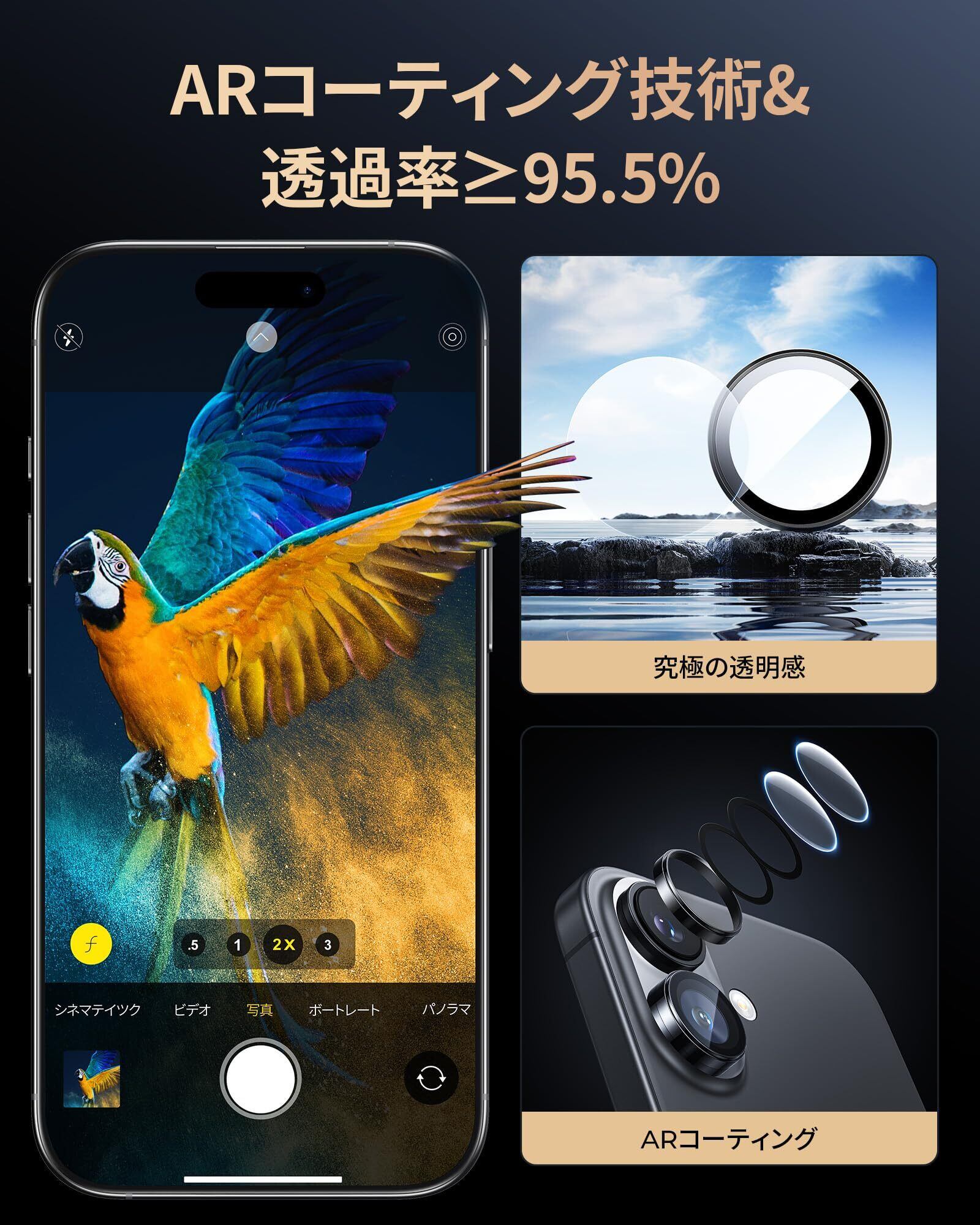 「一体感抜群・ケースとの併用」1:1精密加工のアルミ合金リングとガラスで、レンズに溶け込むような一体感。いPhone17/いPhone16/いPhone16Plus 用レンズフィルムは、まるでレンズを装着していないような自然なデザインで、iPhone本体の設計をありのままに生かし、洗練された高級感を演出!また、無駄なガラス部分を取り除くことで、市販されているほとんどのケースと併用できるので、お気に入りのケースと一緒にお使いいただけます。