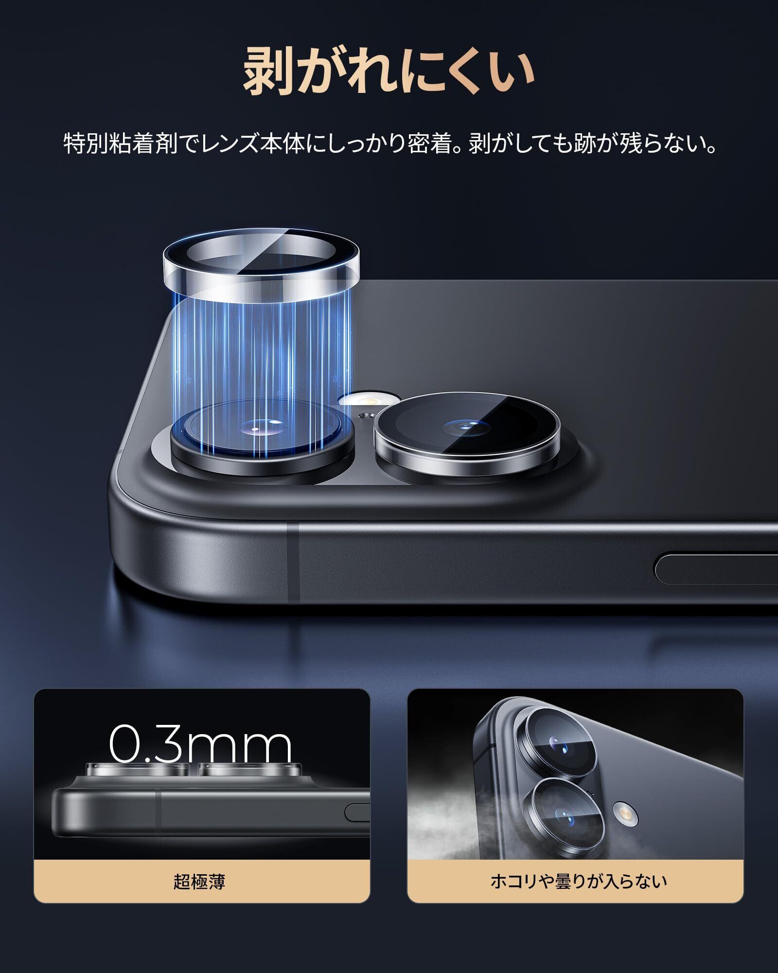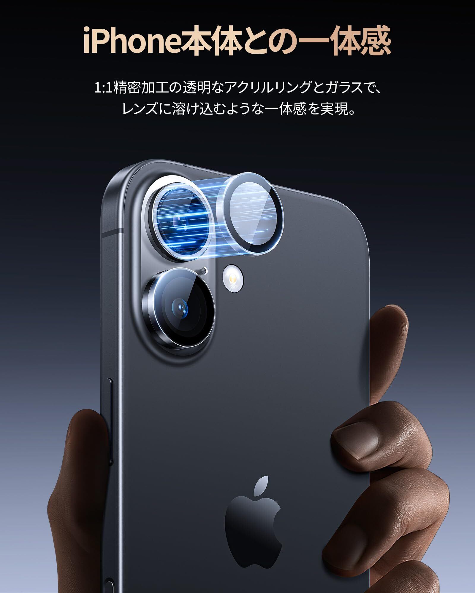 「一体感抜群・ケースとの併用」1:1精密加工の透明なアクリルリングとガラスで、レンズに溶け込むような一体感。いPhone17/いPhone16/いPhone16Plus用レンズフィルムは、まるでレンズを装着していないような自然なデザインで、iPhone本体の設計をありのままに生かし、洗練された高級感を演出!また、無駄なガラス部分を取り除くことで、市販されているほとんどのケースと併用できるので、お気に入りのケースと一緒にお使いいただけます。