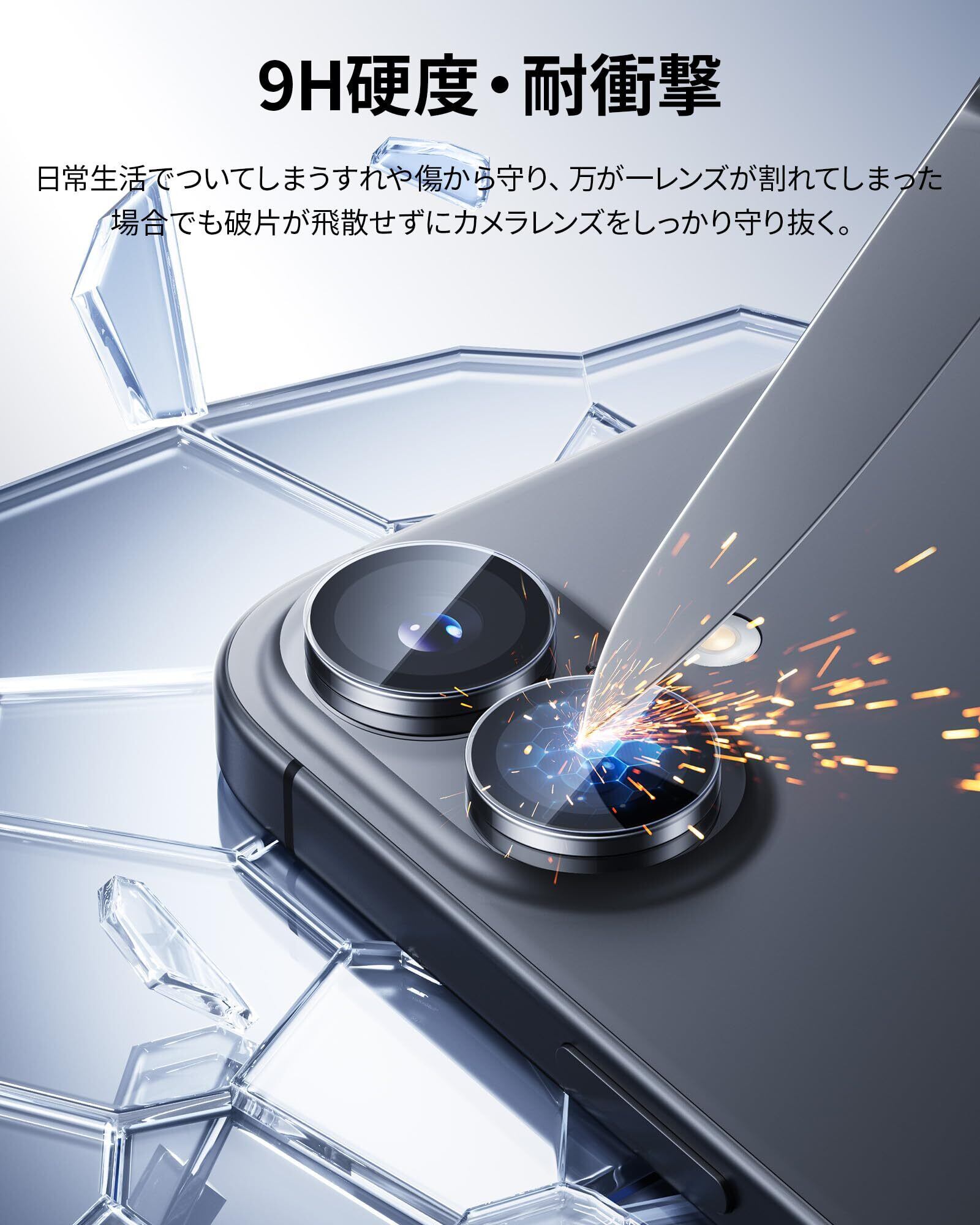 「カメラレンズをしっかり守る」9Hの高硬度強化ガラスを使用しており、鍵などの硬く尖ったものでも簡単には傷がつきません。また、飛散防止設計により、万が一割れてしまっても、破片が飛散せず安全性が高い保護フィルムです。本製品の縁取り部分は、アクリル素材を採用し、さらに保護力をアップしました!