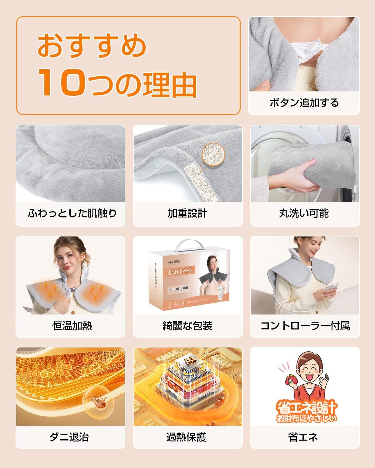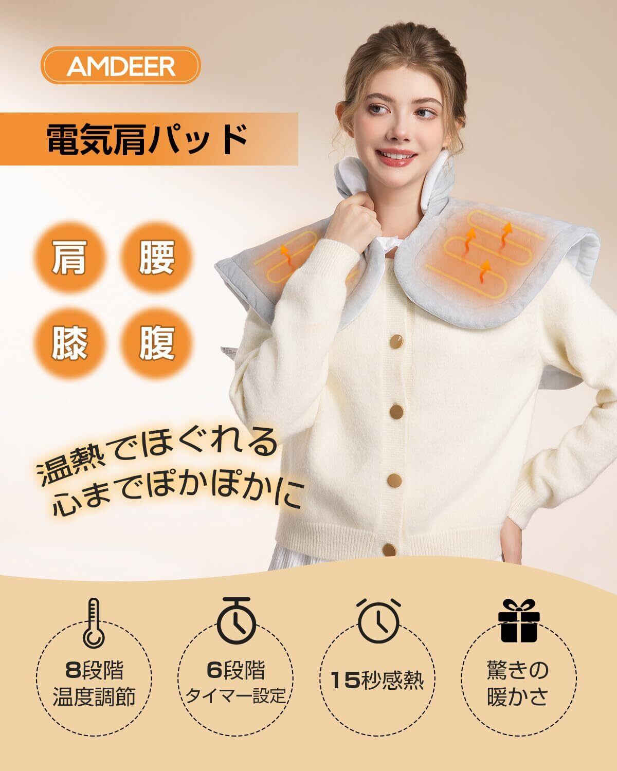 《速暖恒温✕電気肩パッド》Amdeer の電気肩パッドは、日本製グラフェンファイバーヒーターを搭載しています。電源を入れて約30秒で暖かさを実感でき、わずか約3分で首肩から背中まで均一に温めます。さらに、肩掛けの縁に玉砂利が入っている加重設計により、背中へのフィット感を向上させ、暖かさを逃がさない構造になっています。肩や首はもちろん、腹部、腰、膝、足元、背中など、体のさまざまな部位に対応できます。在宅ワークや受験勉強、スポーツ観戦など、室内で肩の温めグッズです。省エネ設計で経済的、軽量で携帯しやすく、自宅はもちろん、車中泊やアウトドアなど、幅広いシーンで活躍します。自分へのご褒美としてはもちろん、ご家族や友人へのプレゼントにも最適です。