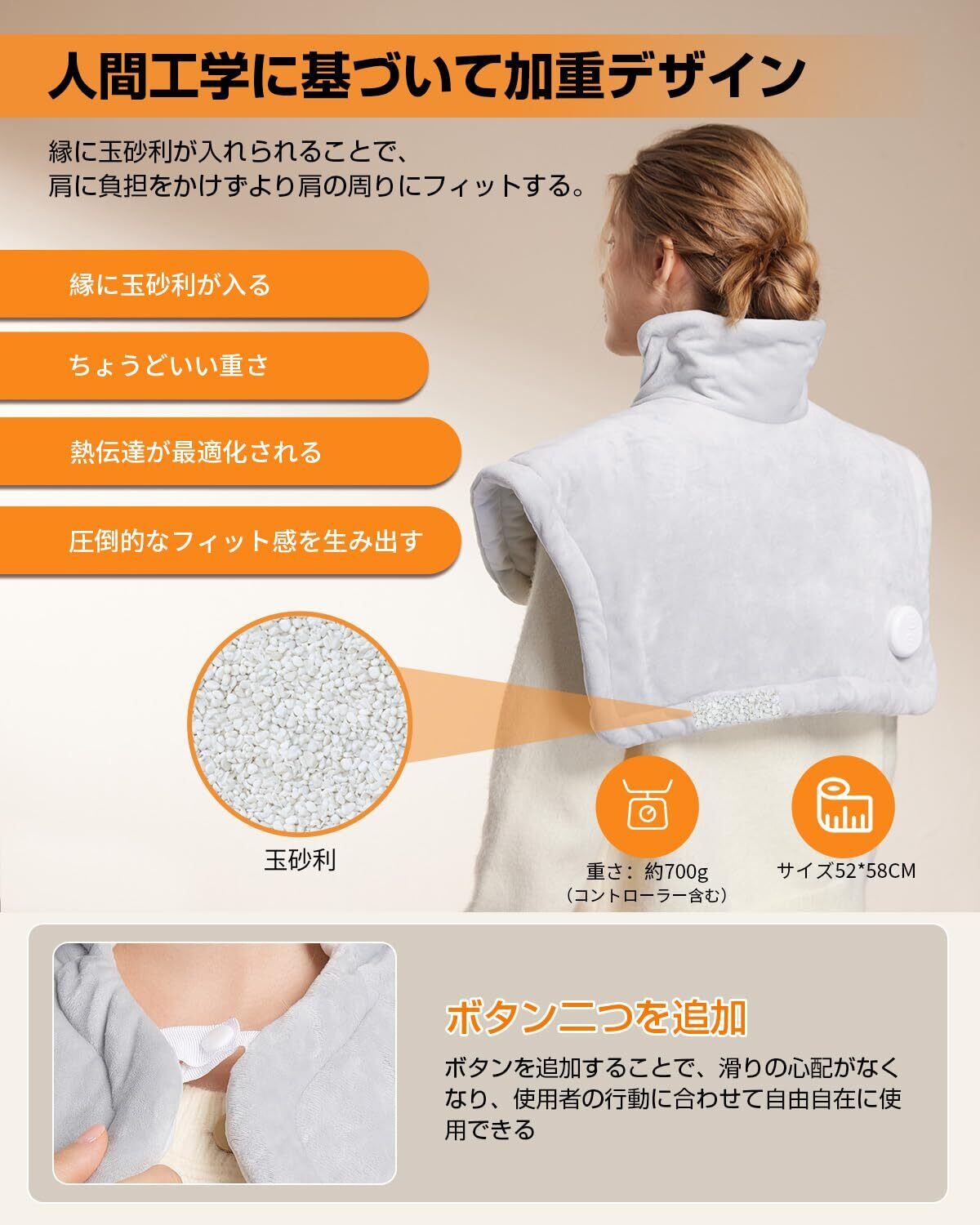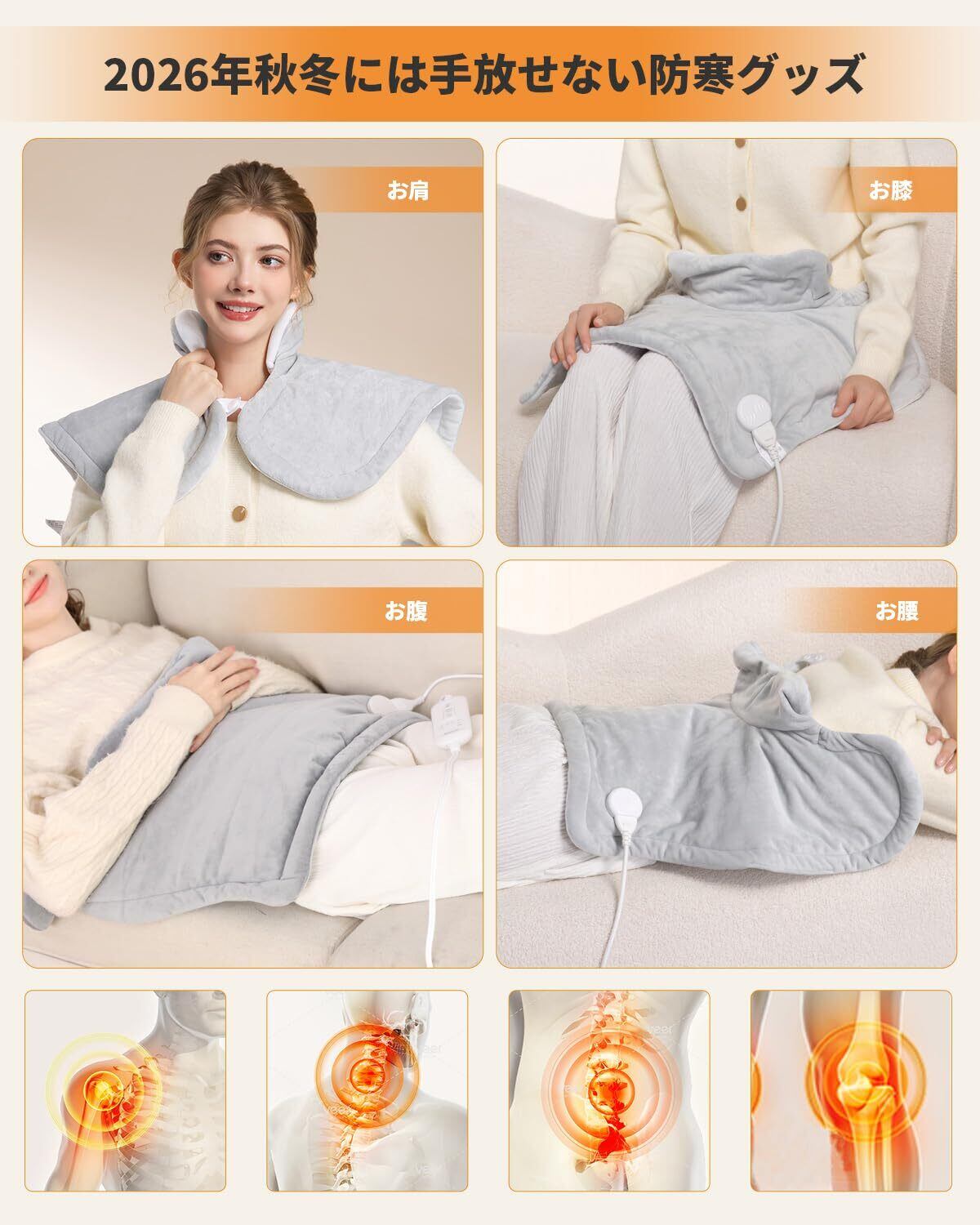 《両面ウェアラブルデザイン・丸洗い可能・収納便利》柔らかくて心地よい両面フランネルで作られて、表面がツルツルしてやさしい肌触りです。また、加熱 肩当ては洗濯機で洗えるので、いつも清潔に保って、繰り返し使用可能です。洗濯前、必ず電源コードを取り外してください。洗濯機で洗う場合は洗濯ネットをご使用ください。使わない時は丸めてコンパクトになり、置き場所・収納場所に困らない!ポタンニつを追加することで、滑りの心配がなくなり、使用者の行動に合わせて自由自在に使用できます。