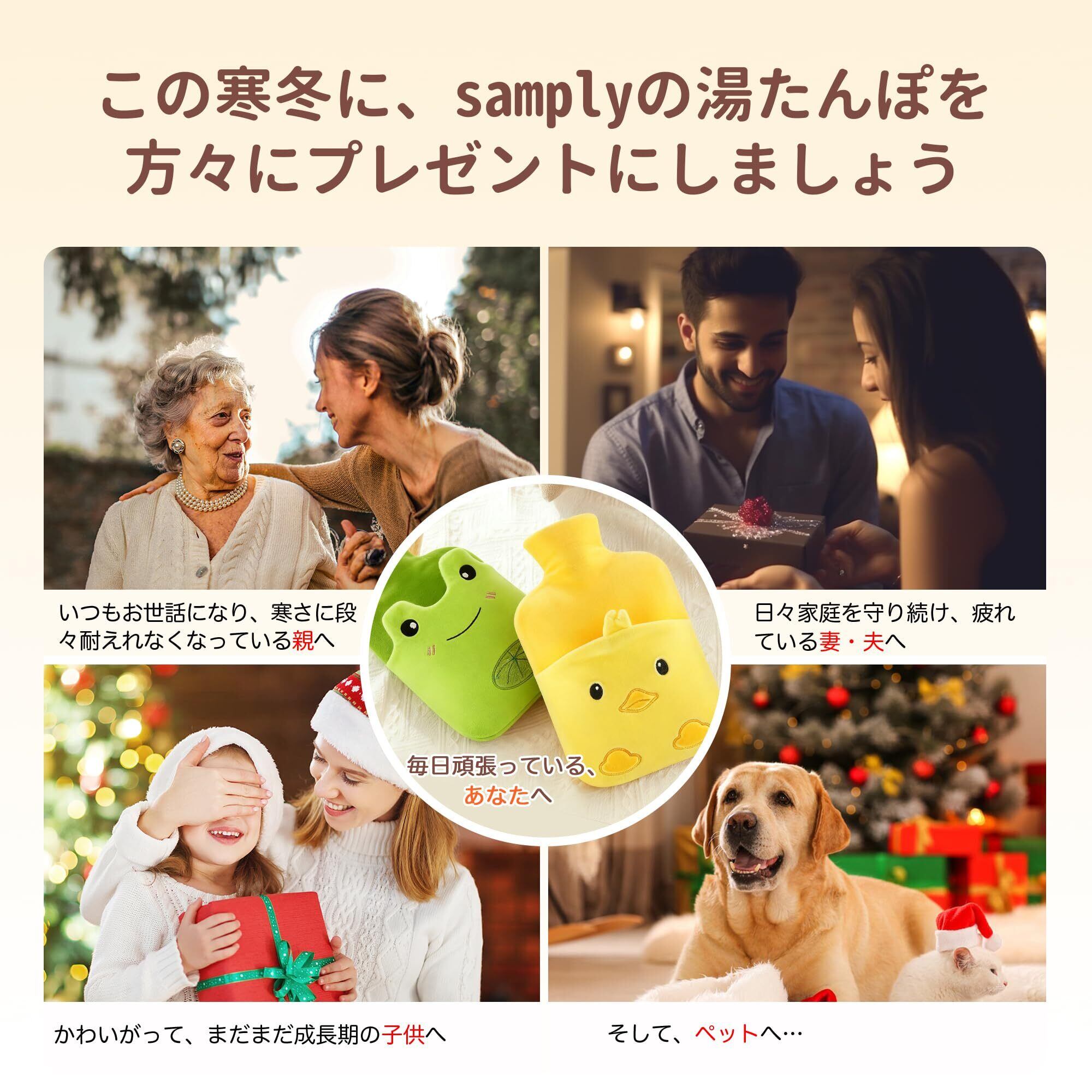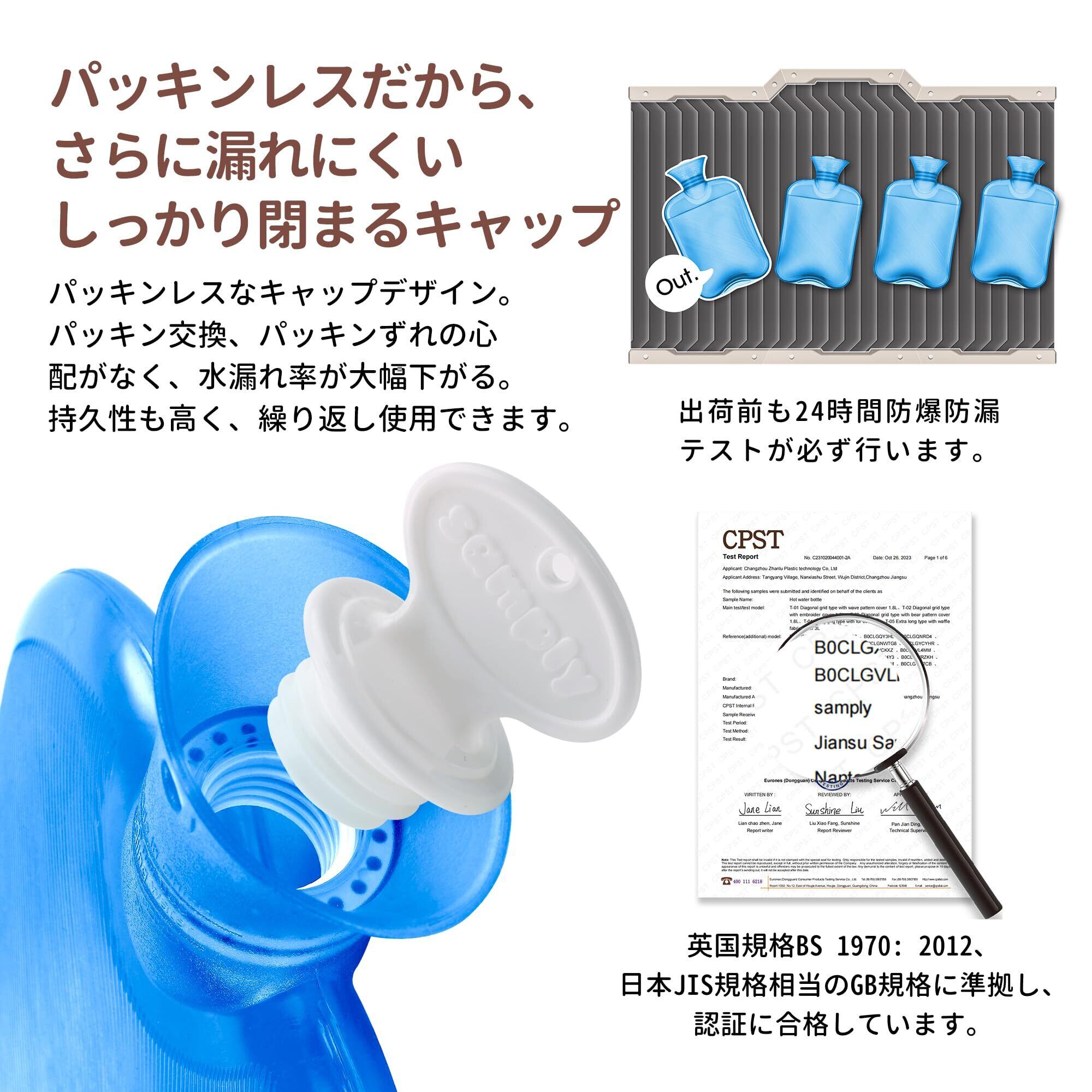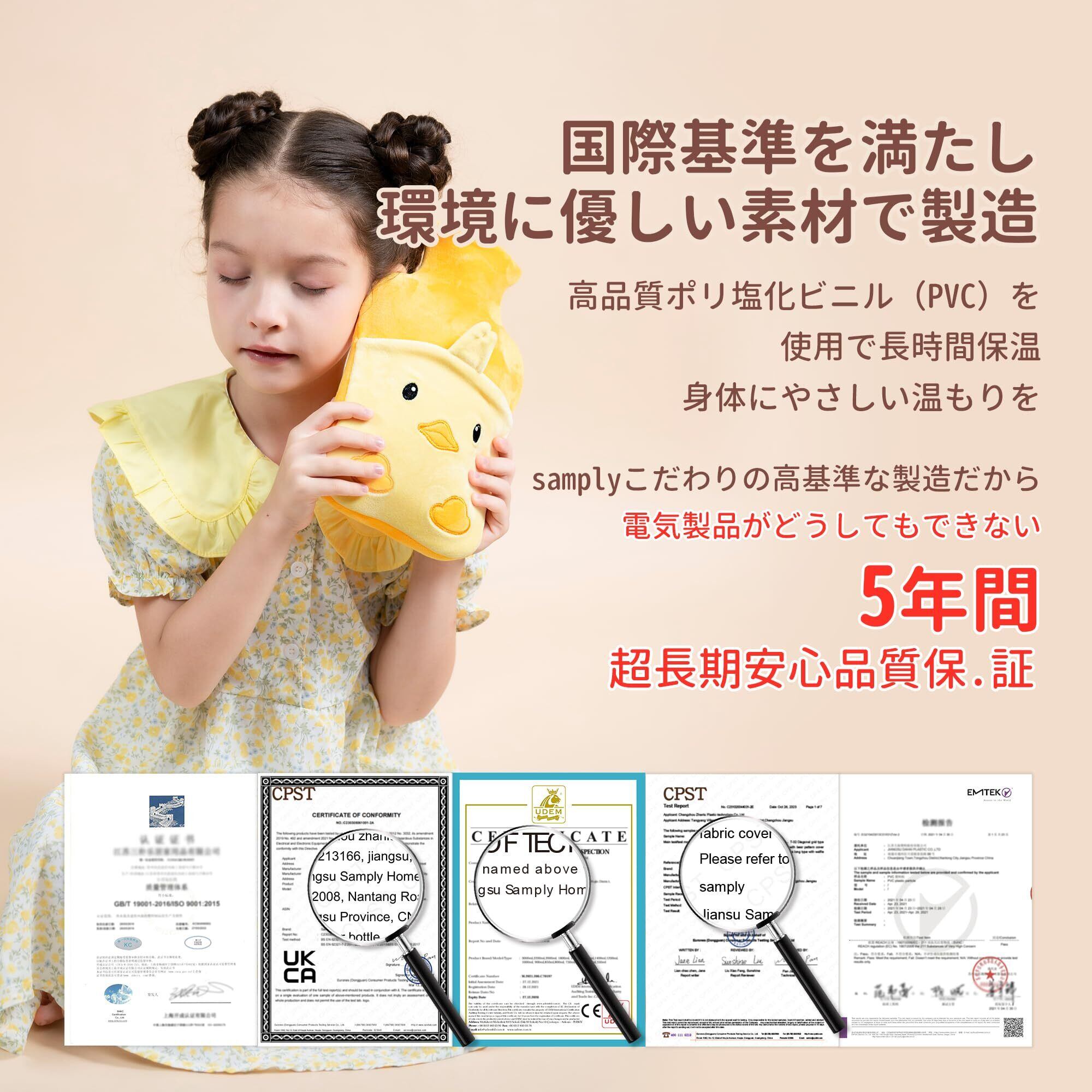 「5年間超長期安心サポート」samplyの湯たんぽは英国規格BS 1970:2012に準拠し、日本JIS相当のGB規格にも合格。出荷前には24時間の防爆・防漏テストを実施済みで、耐荷重500kg以上をクリア。5年間の長期保証付きで、万一初期不良やご不明点がある場合は、購入履歴からお気軽にお問い合わせください。