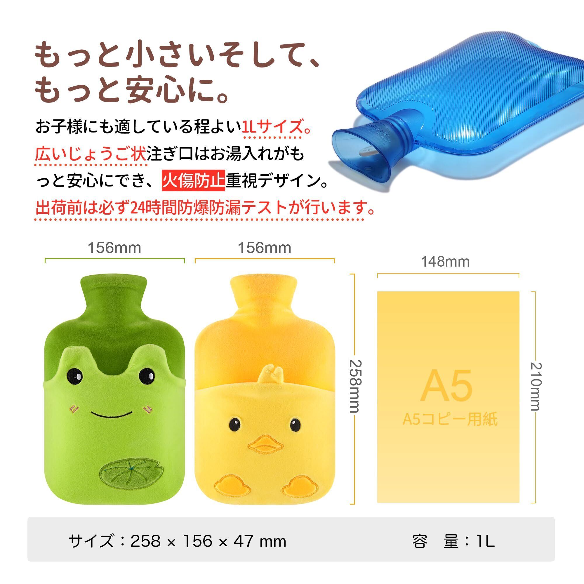 「カバー付」本体サイズ:25.8×15.6cm、本体容量:1000ml。付属のカバーは高品質ポリエステル製で、ふんわりとした肌触りが特徴。毛玉や毛抜けが起きにくく、快適にご使用いただけます。かわいいヒナデザインと豊富なカラー展開で、家庭用からオフィス用まで幅広く対応。カバーは取り外して手洗い可能なので、常に清潔な状態を保てます。