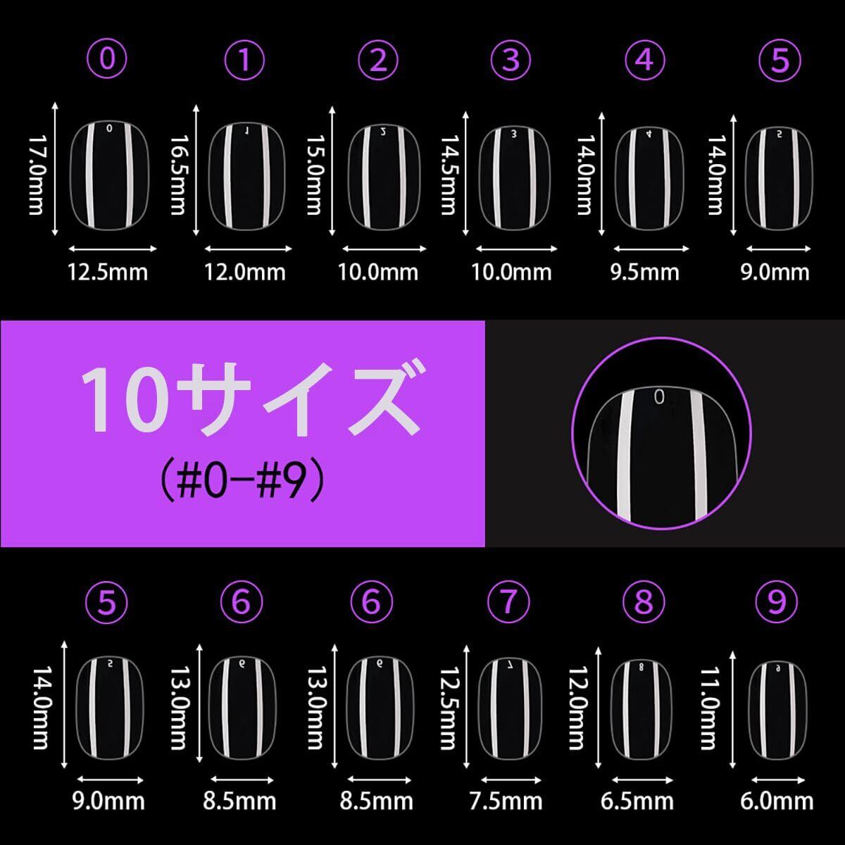 【10種類の異なるサイズ】:このネイルパッチは10種類のサイズがあり、各サイズは20個(5号と6号は40個)ある。各サイズには0~9の独立番号があり、ほとんどの女の子の爪のサイズに合うようになっています。