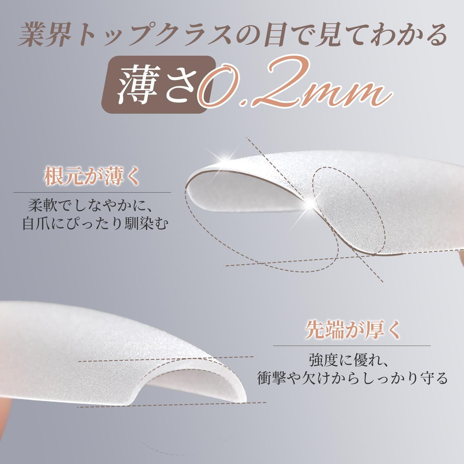 【業界トップクラスの驚異的な薄さ!】長さだしチップは全体的に非常に薄く、特に爪の根元は約0.2mmの超薄型設計。まるで自爪のような軽さとフィット感で、装着を忘れる快適さを実現。段差もほとんど感じられず自然な仕上がりです。面倒な下処理不要のサンディング済みで、驚きの薄さをぜひ体感してください。