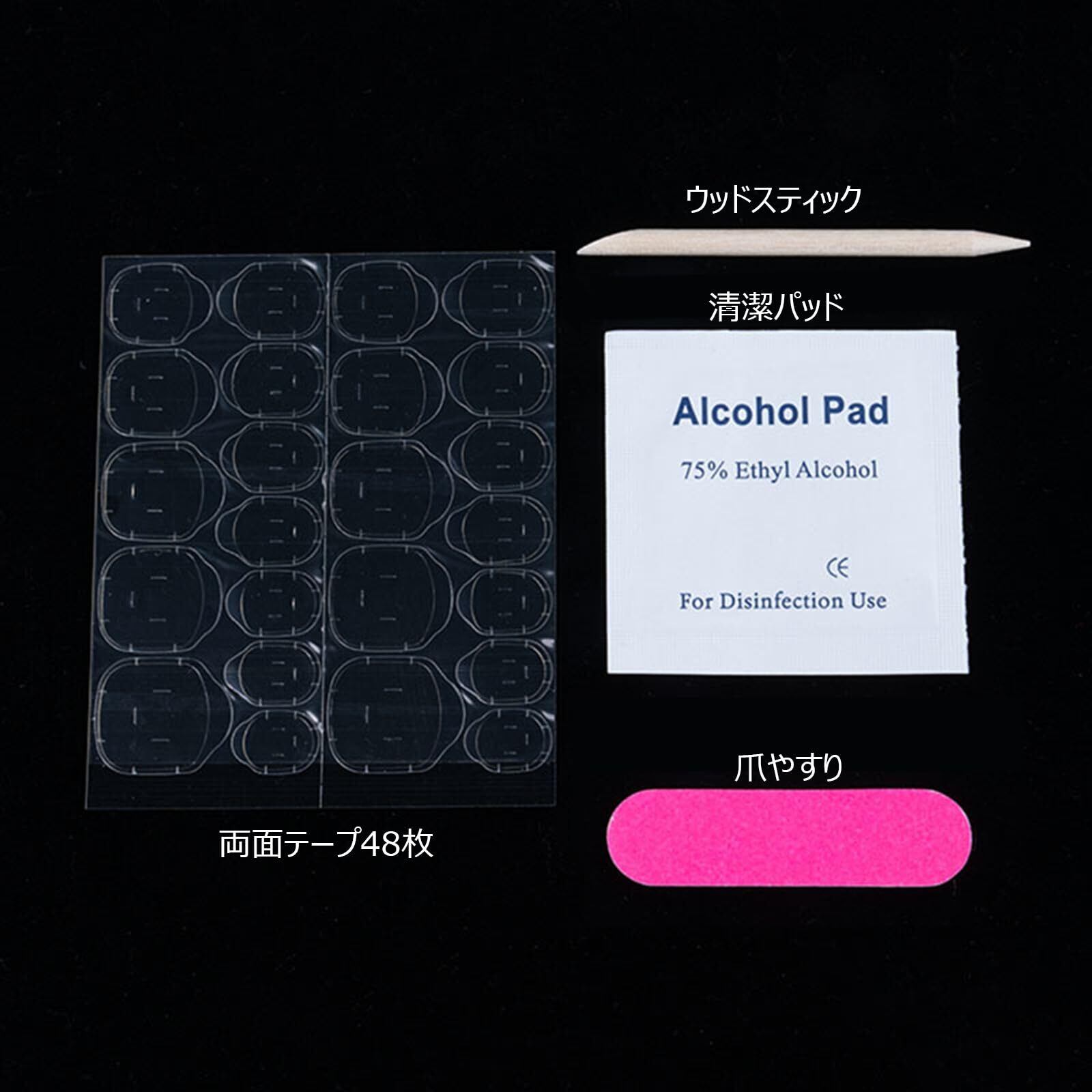 ネイルチップ12サイズ24枚/30枚、両面テープ48枚、爪ヤスリ1枚、木棒1枚。