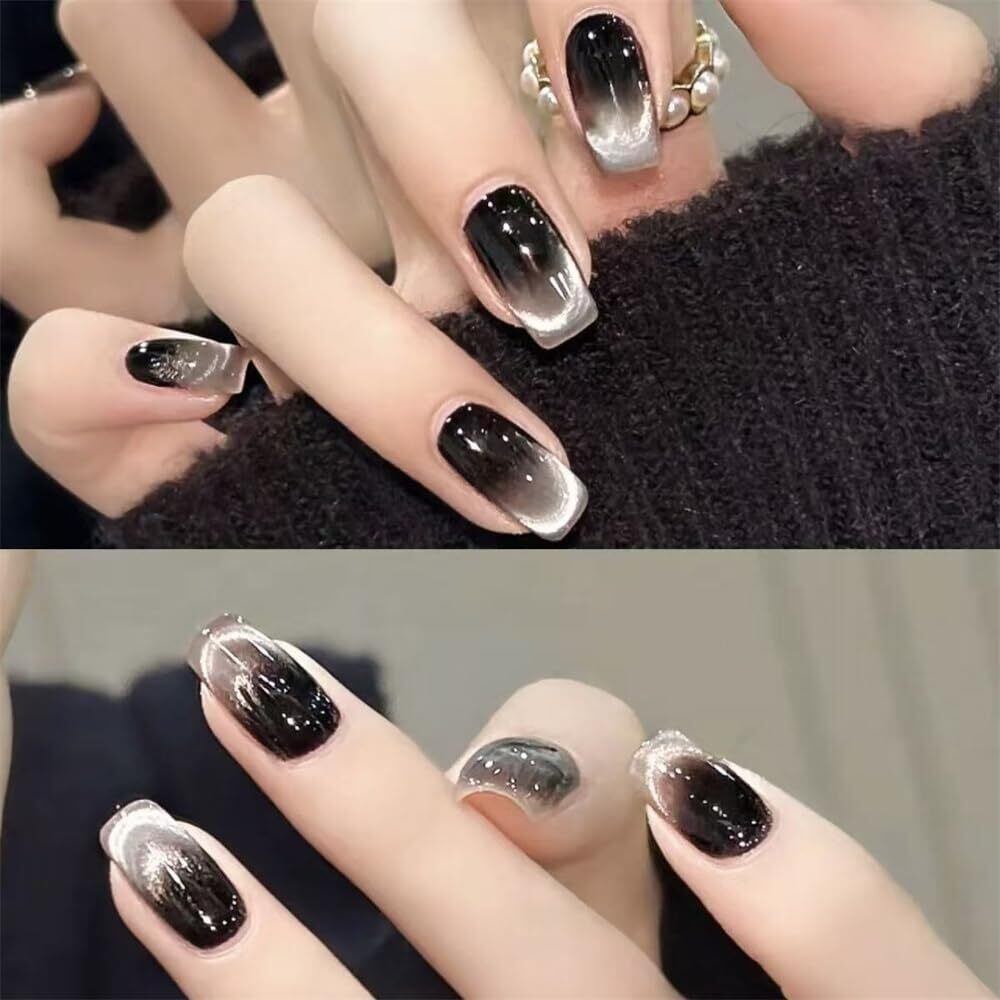 ネイルチップショート 24枚入 3D爪 ネイルプレス 手作りカラーネイル キャッツアイネイル24枚入 繰り返し使える 結婚式ネイルチップ かわいい ネイルチップ 人気 花嫁ネイル 光沢 レディース ギフト (黒-猫目石)
