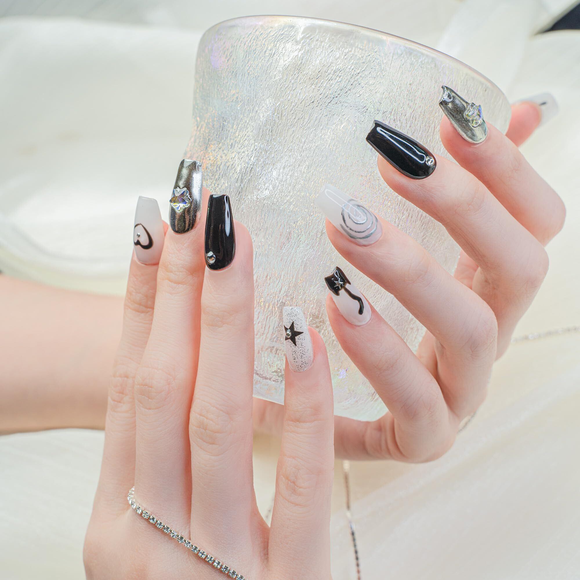 Sun&Beam Nails 手作り ネイルチップ ミディアム ロング コフィン バレリーナ ブラック ホワイト つけ爪 手描き ストーン こねこ デザイン おしゃれ 付け爪 10枚入 (#207 M)