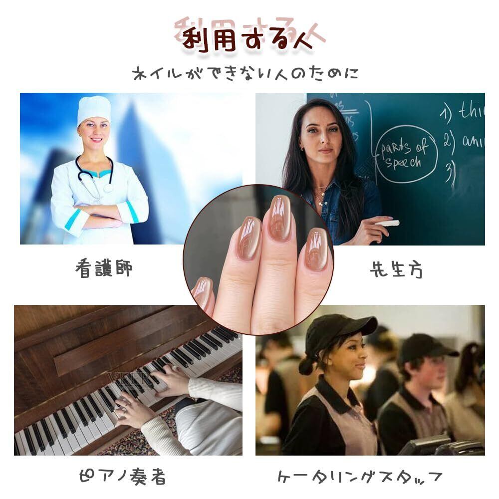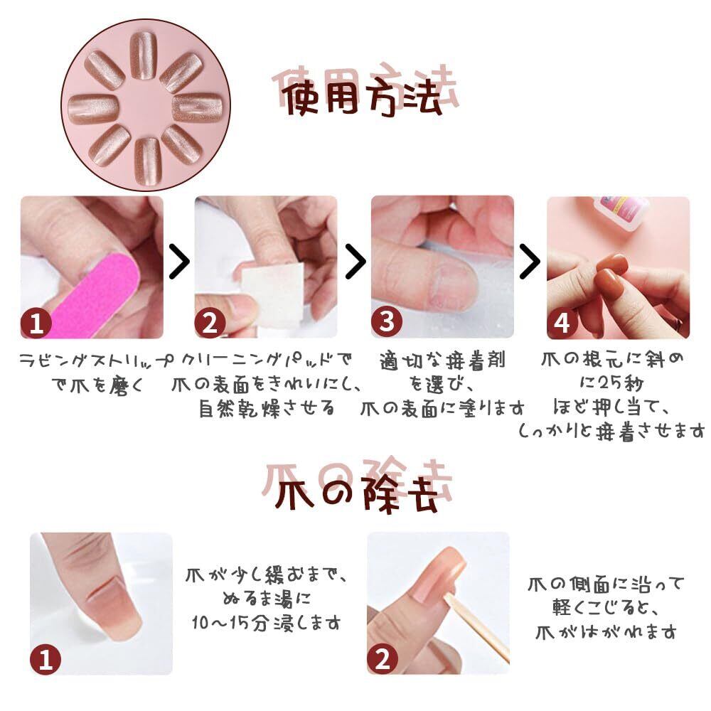 【簡単な使用方法】自分の爪を磨いた後、適切なサイズのネイルチップを選び、専用のジェル接着剤を塗って30秒間押さえるだけで、簡単に美しいネイルを完成させることができます。初心者でも簡単に使えるので、手軽にサロン級の仕上がりを楽しめます。