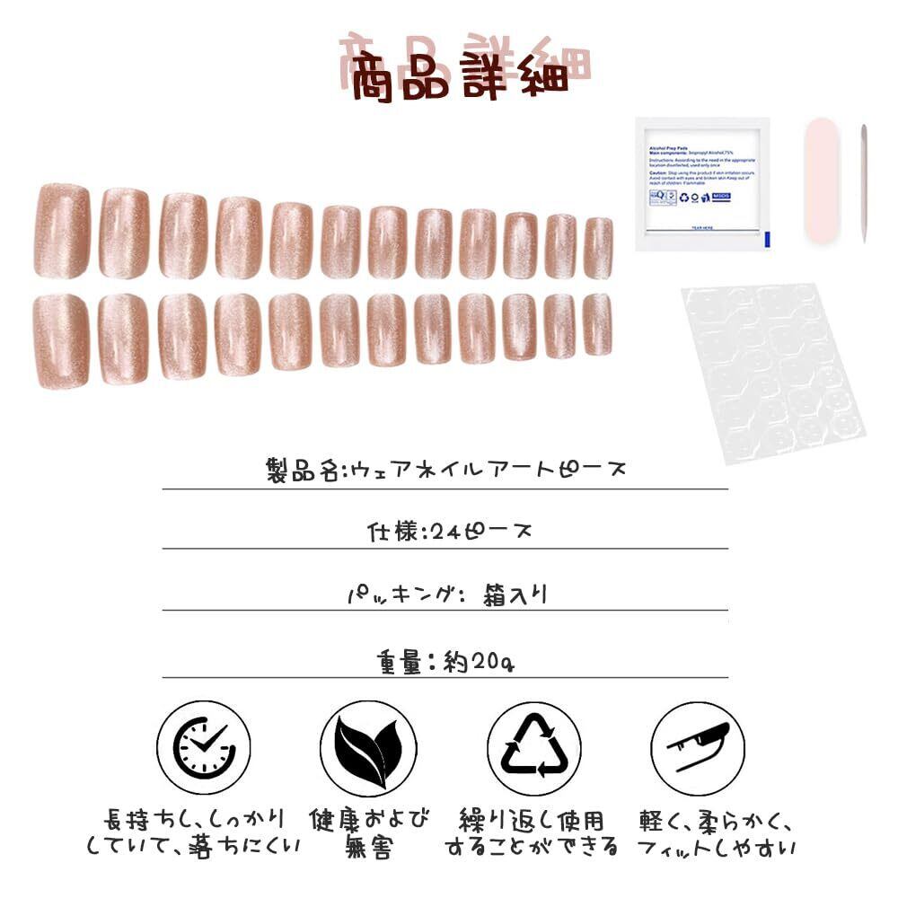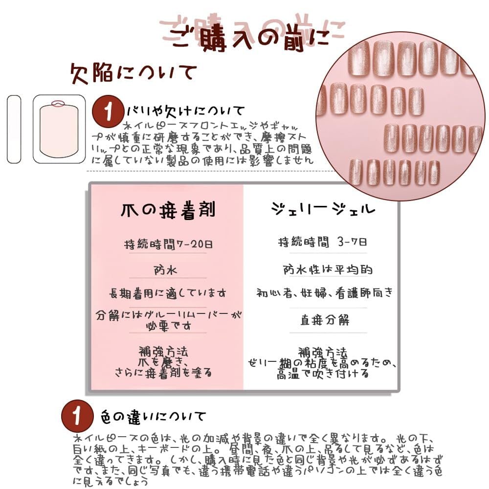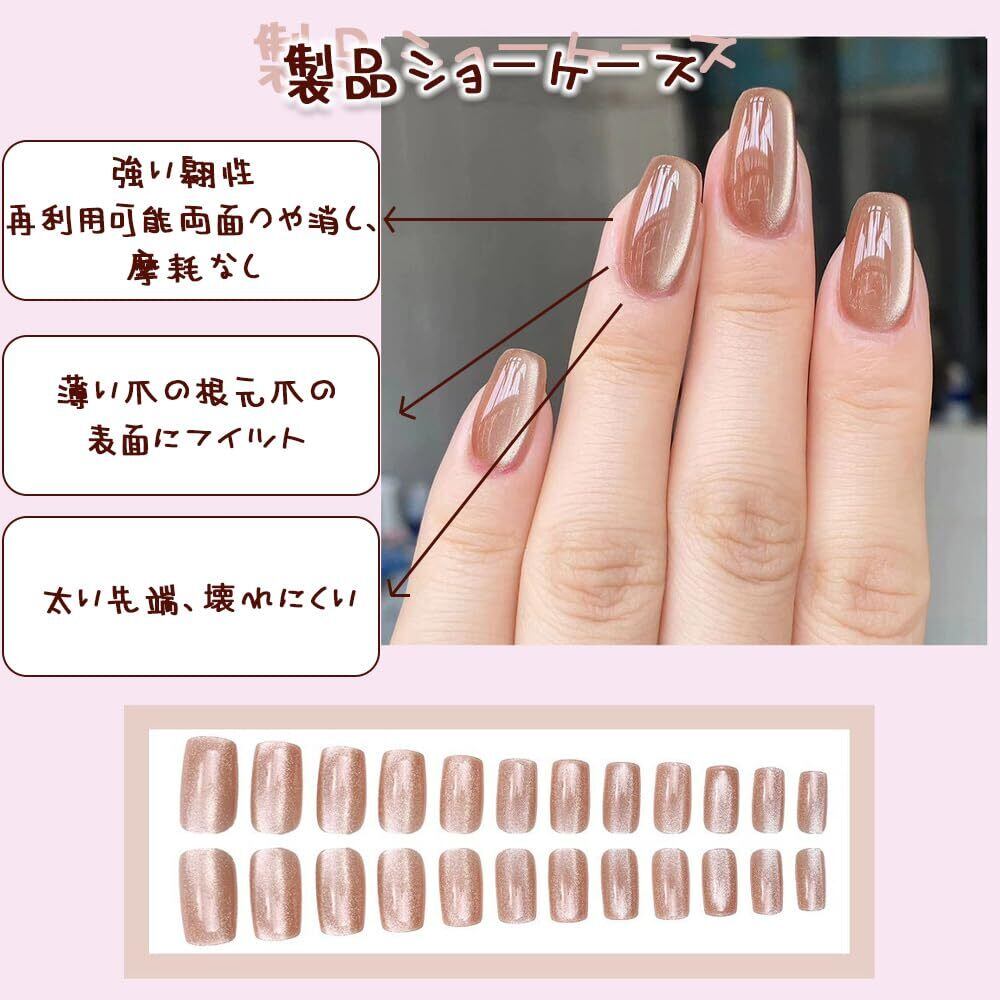 1.【猫眼デザインの美しいジェルネイルチップ】高級感のある猫眼デザインのネイルチップ。ショートスクエア型で、秋冬にぴったりな落ち着いた色合いで、指先を美しく演出します。シンプルでありながら華やかさもあり、どんなシーンにもマッチします。 2.【高品質な素材】このネイルチップは高品質な素材で作られており、爪や皮膚に優しく、非毒性で安全です。耐久性があり、傷が付きにくいので、長期間使用できます。お肌に優しいため、敏感肌の方でも安心してご使用いただけます。 3.【簡単な使用方法】自分の爪を磨いた後、適切なサイズのネイルチップを選び、専用のジェル接着剤を塗って30秒間押さえるだけで、簡単に美しいネイルを完成させることができます。初心者でも簡単に使えるので、手軽にサロン級の仕上がりを楽しめます。 4.【12種類のサイズが付属】24枚のネイルチップは、12種類のサイズがあり、指にぴったりフィットするサイズを選べます。どんな指の大きさにも対応しているため、誰でも簡単に使用できます。 5.【パーティーやギフトにも最適】このネイルチップは、プロフェッショナルなネイルサロンでも使用され、DIYで自宅でも楽しめます。また、友達や親しい人へのプレゼントにも最適です。特別なイベントやパーティー、日常生活でも大活躍します。
