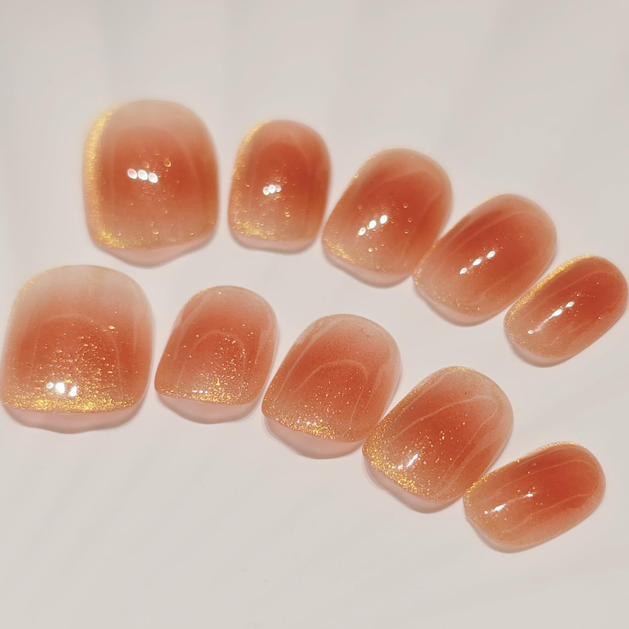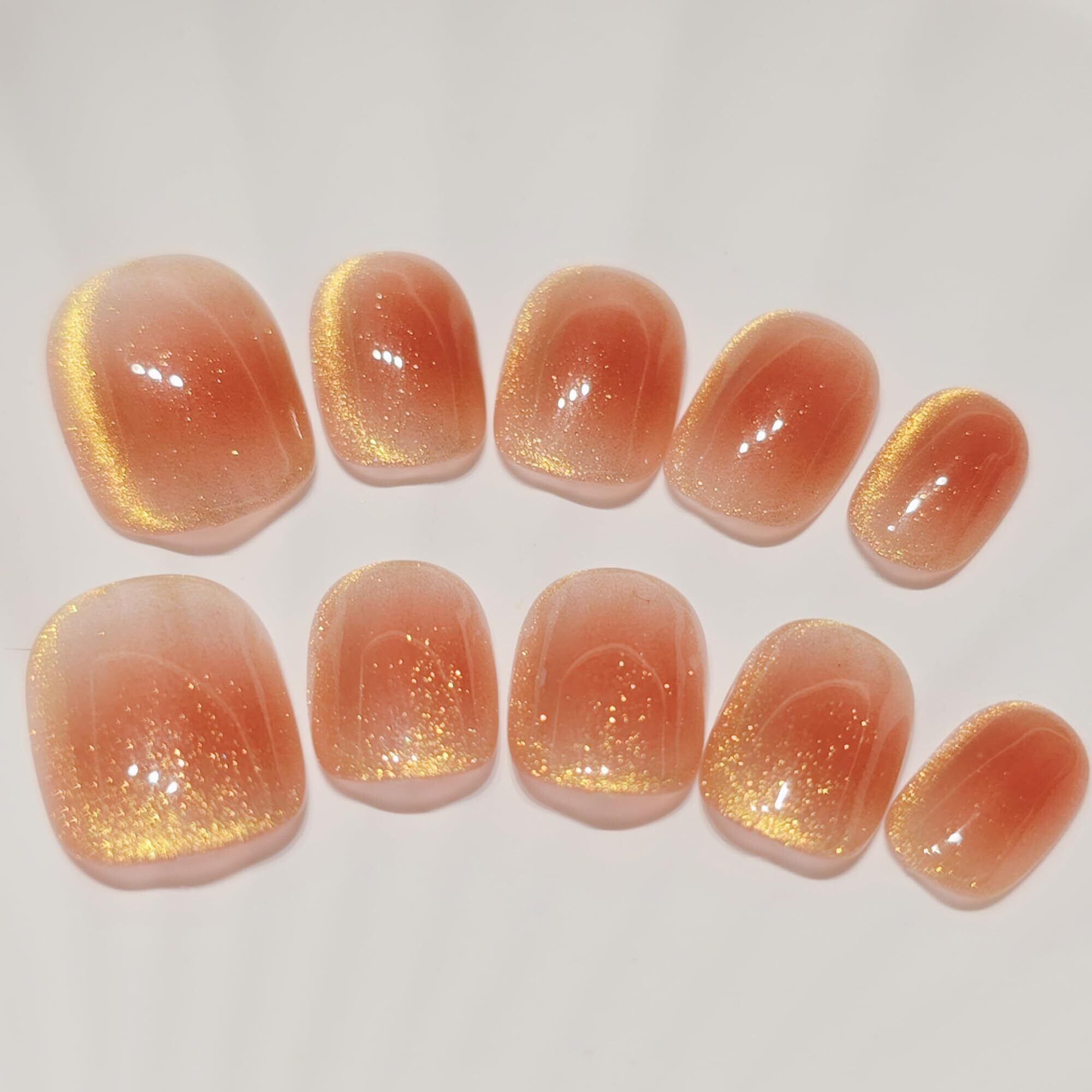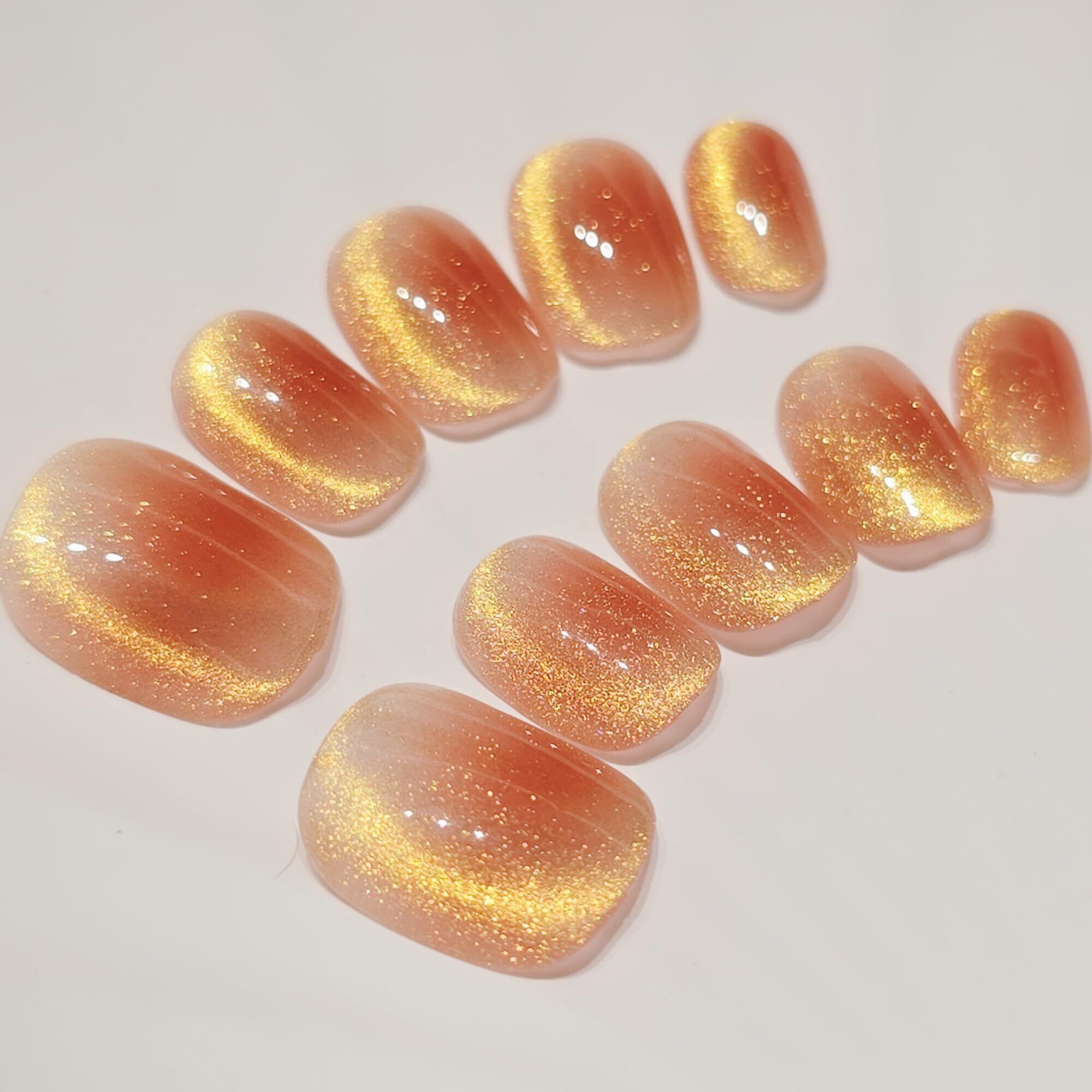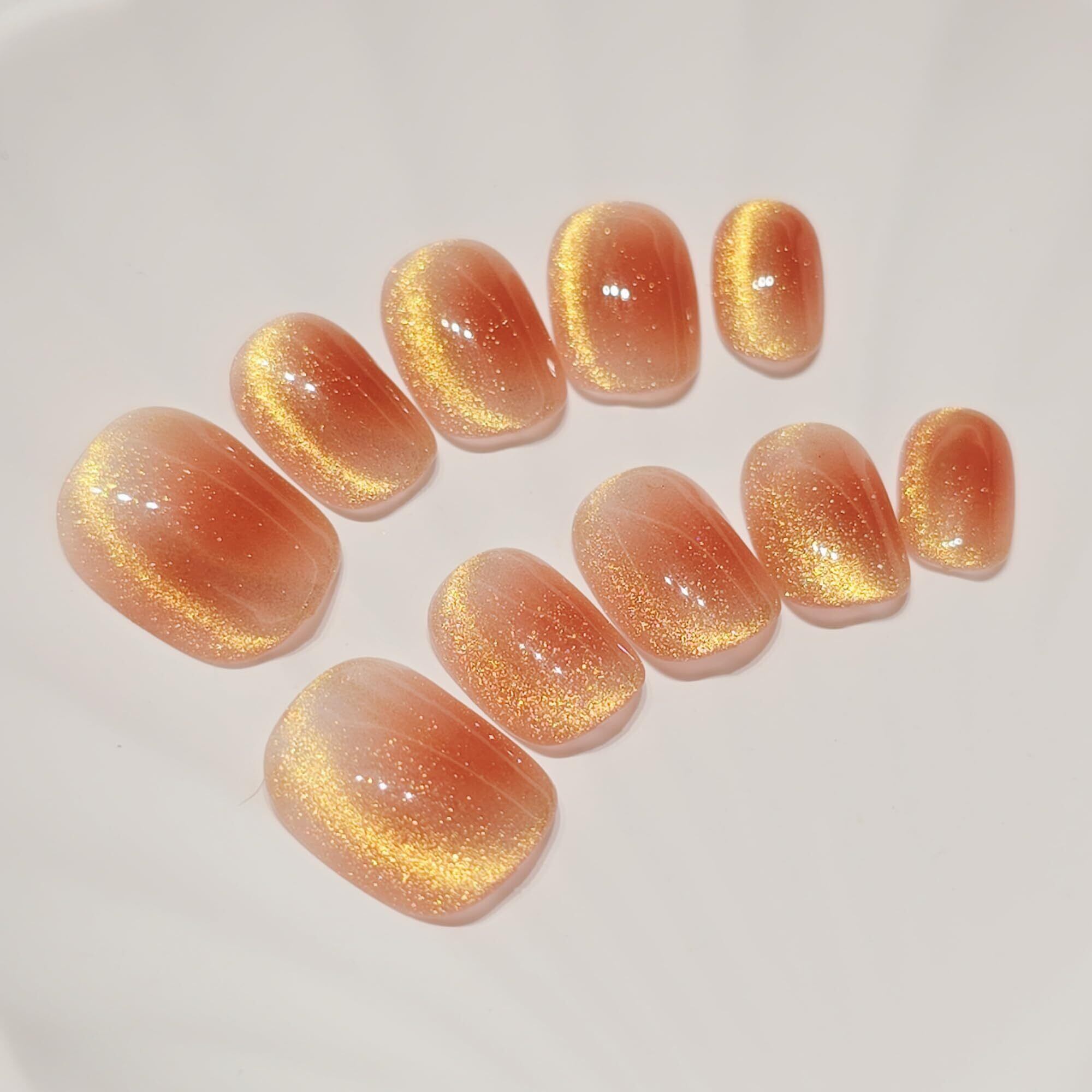 ネイルチップ C形キャッツアイ ゴールドグラデーション ショートネイルチップ 光沢 猫 手作り 秋と冬 ネイルチップ10枚(#01,M)