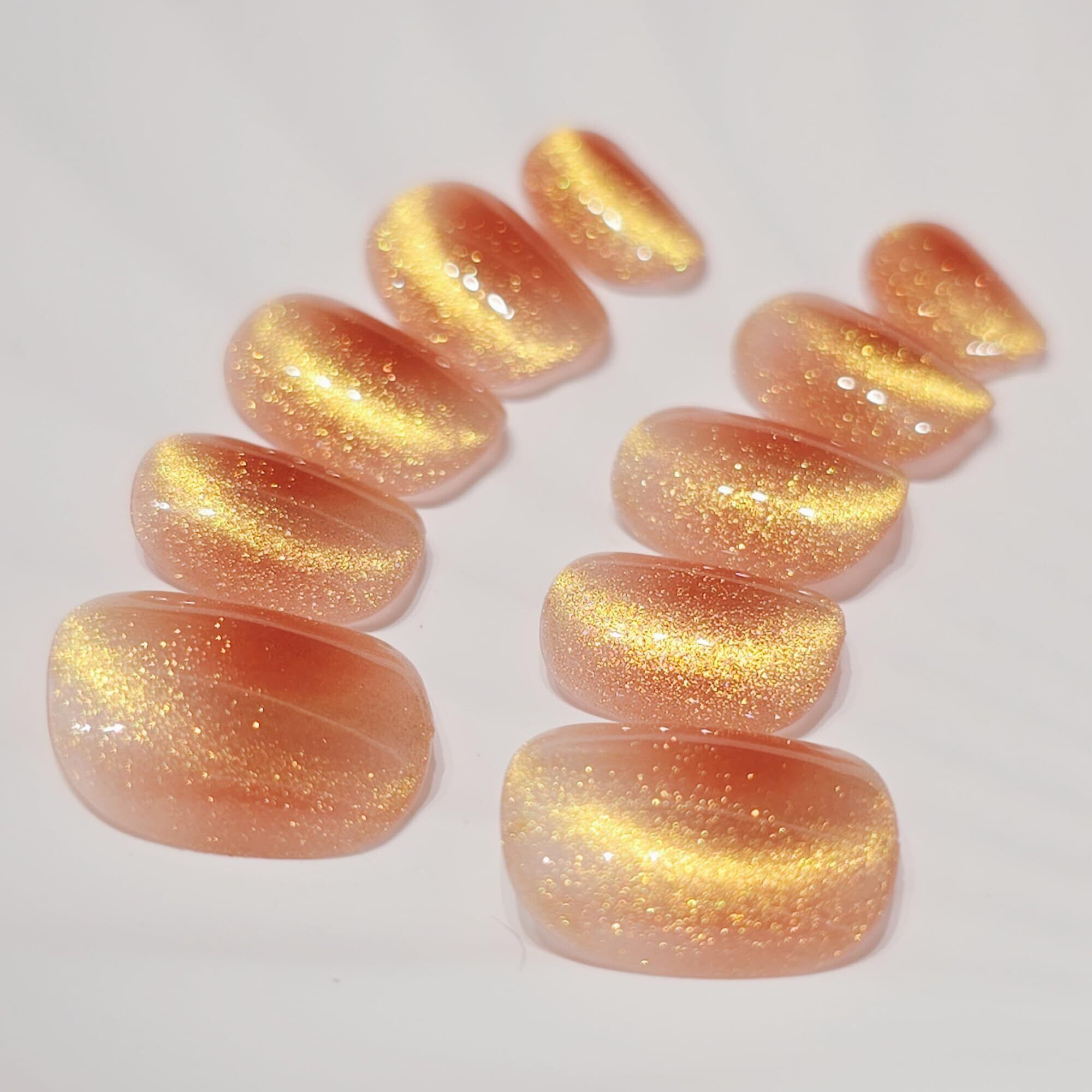 【デザイン】 100%手作りネイルチップ。C形キャッツアイとゴールドグラデーションが繊細に融合したショートタイプ。ピンク地に金色のきらめきが上品に輝き 肌なじみの良いシンプルデザイン。光沢感のある仕上げで 10枚組で日常使いに最適