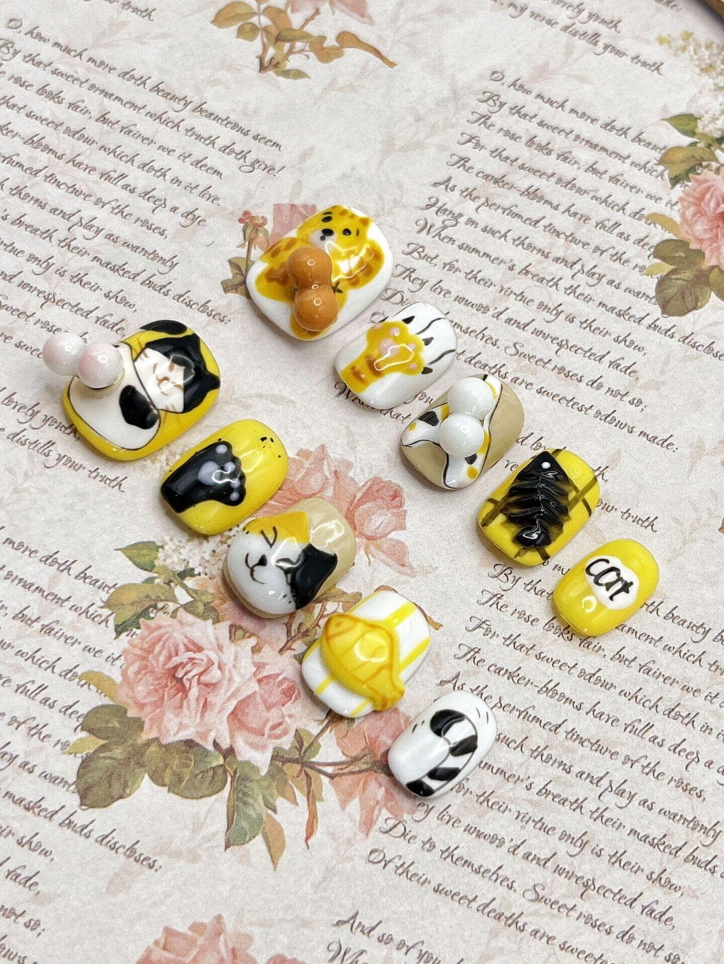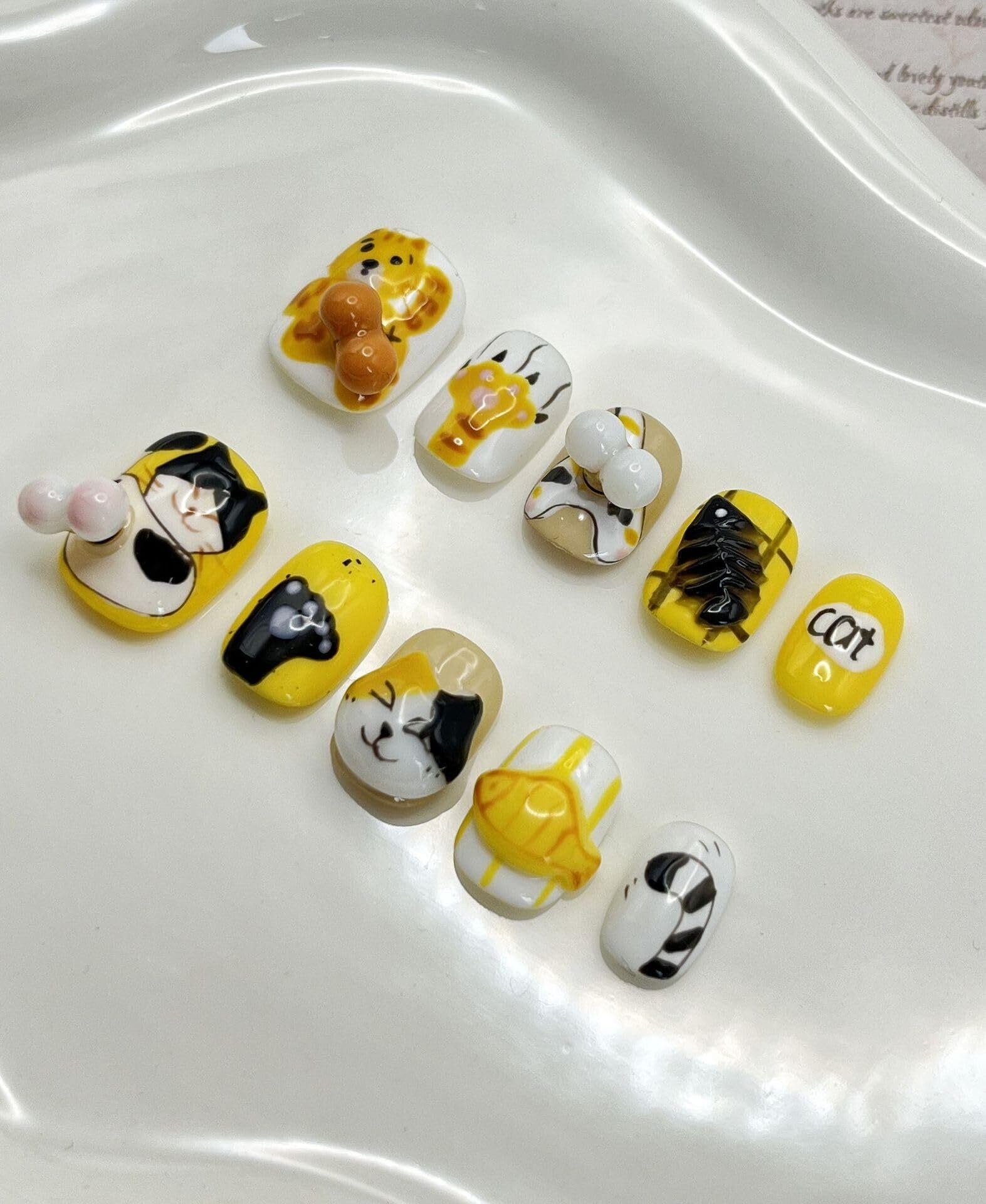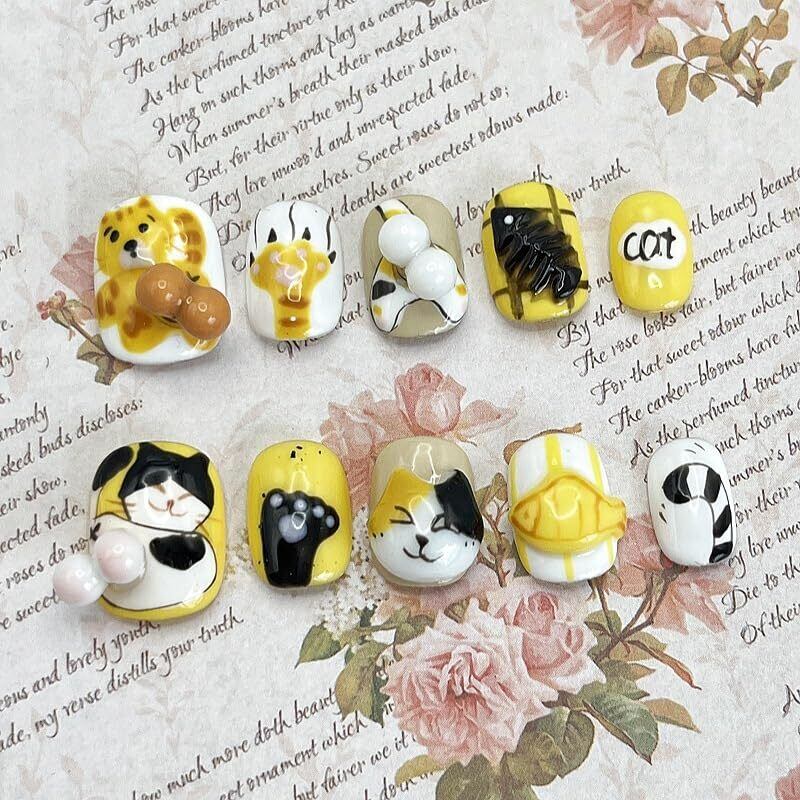 <*恋鯉ネイル*>手作り3Dネイルチップ |猫 · ネコ · ニャンコのタマがぐるぐる回れる!!|ショート|10枚入り|つけ爪・ジェルネイル・ウェアラブルネイル・かわいい・三次元・手描き・ネイルアートパッチ・5D水彩カートゥーン (#35-猫のタマが回れる!!, S)