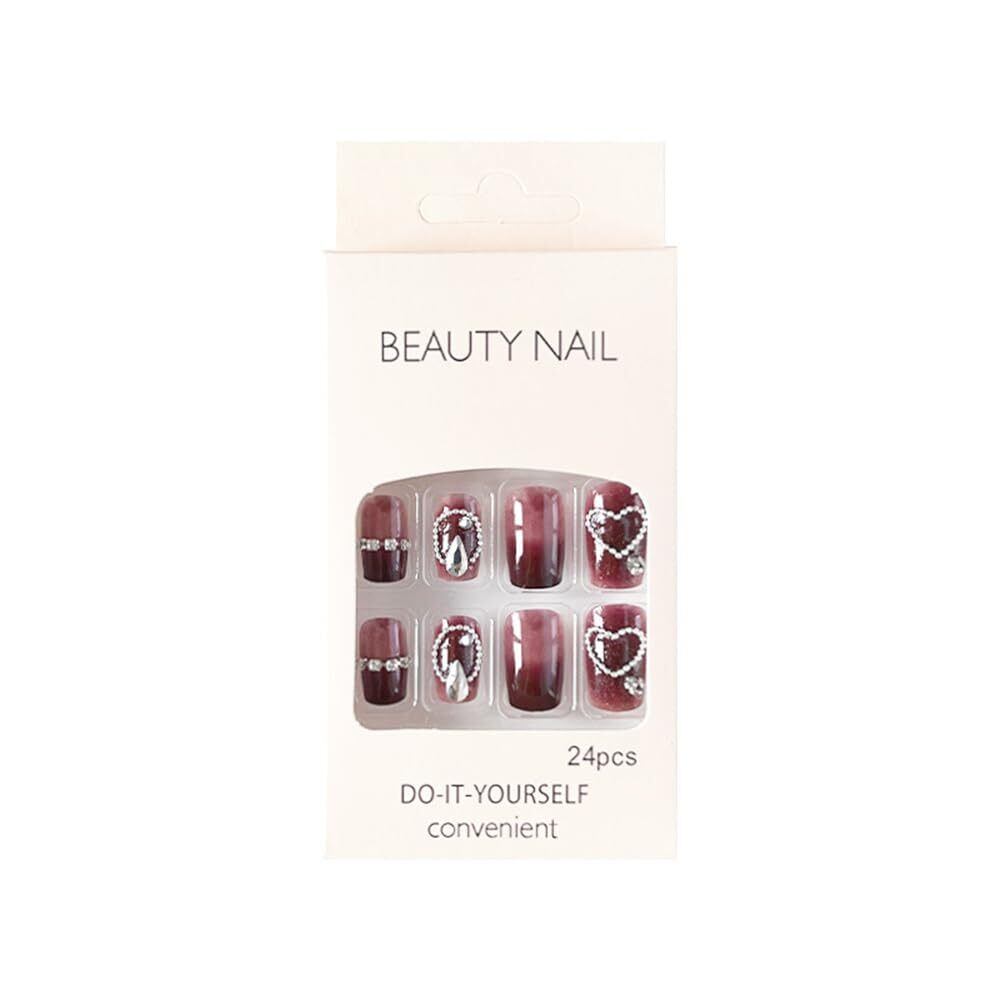 ネイルチップショート 秋冬 3D爪 ネイルプレス 手作りキャッツアイ・ネイルチップ 繰り返し使える 成人式 新年 正月 ぎらぎら かわいい レッド系 ネイルチップ 人気 光沢 レディース ギフト (ハートと ラインストーン, Free Size)