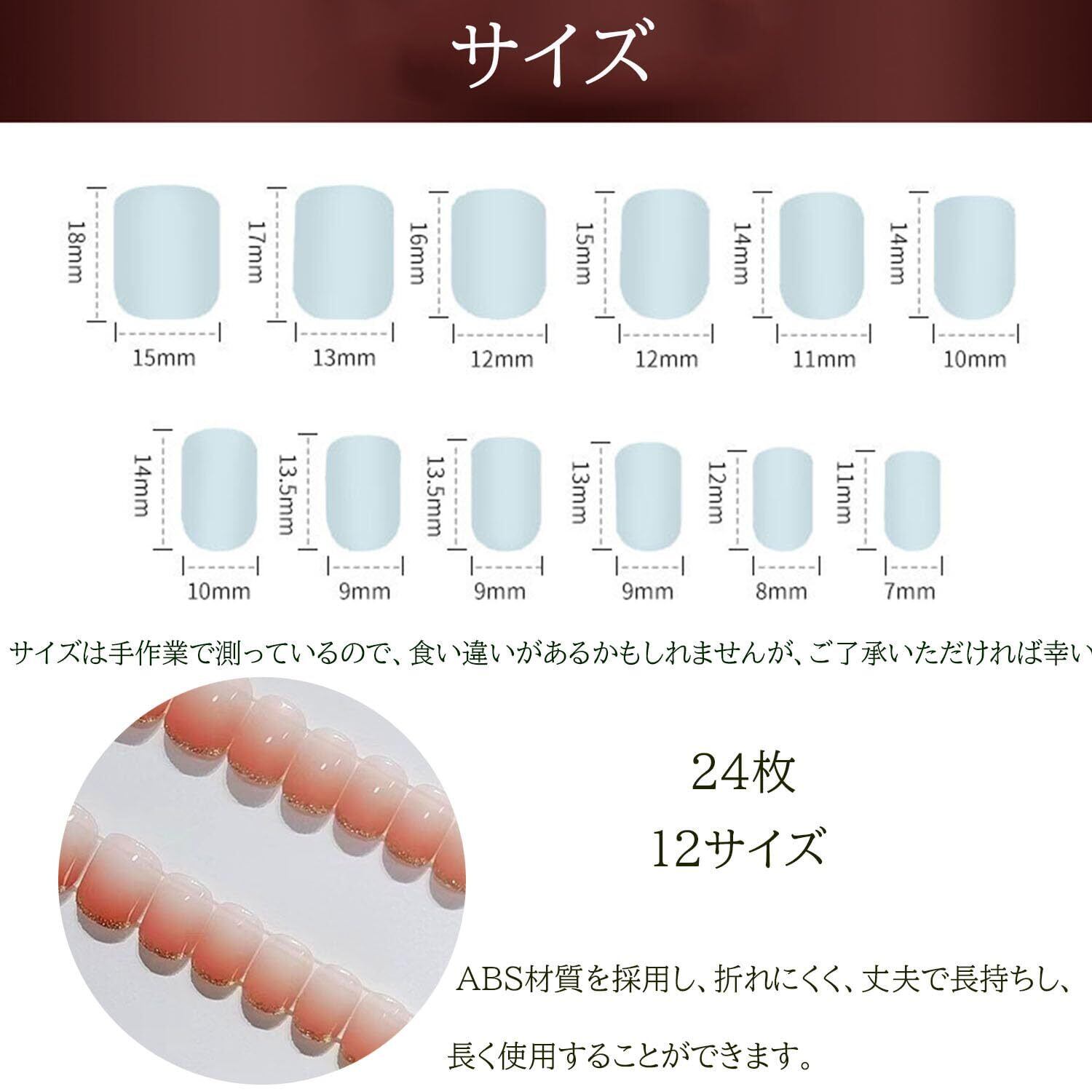 「再利用可能」24枚のラウンドチップセットは、厳選されたABS材質で作られており、付け爪は丈夫で長持ちし、繰り返し使用でき、長時間使用することができます。