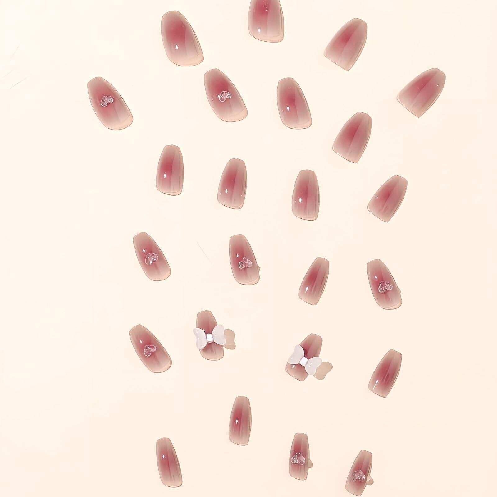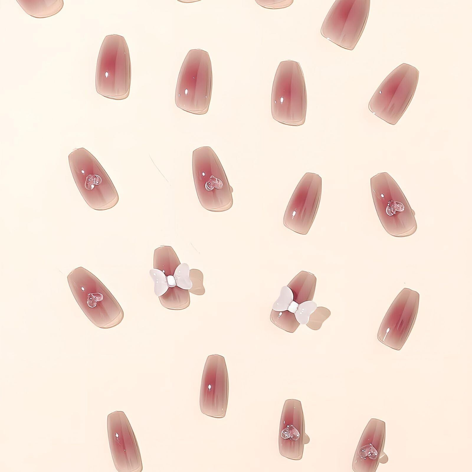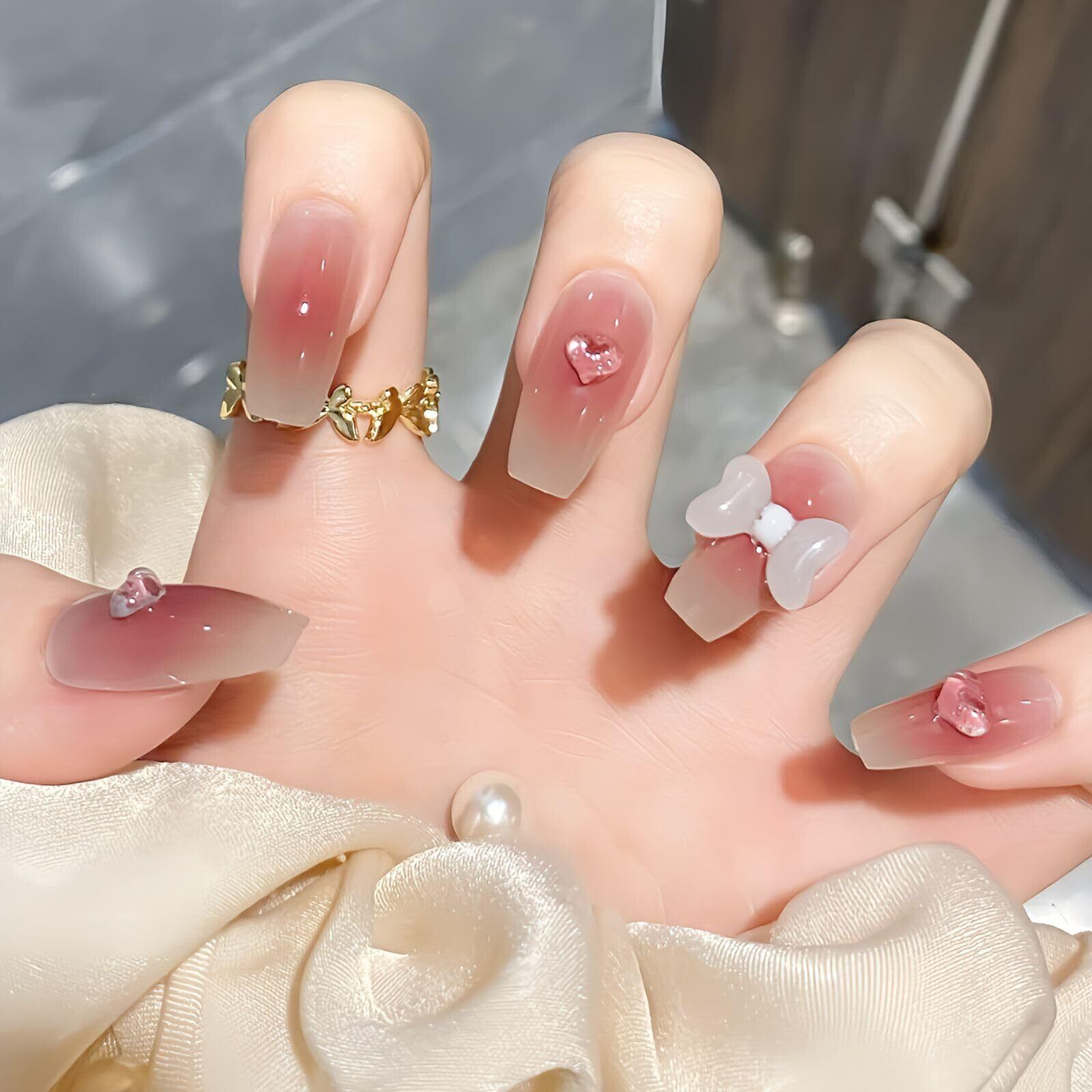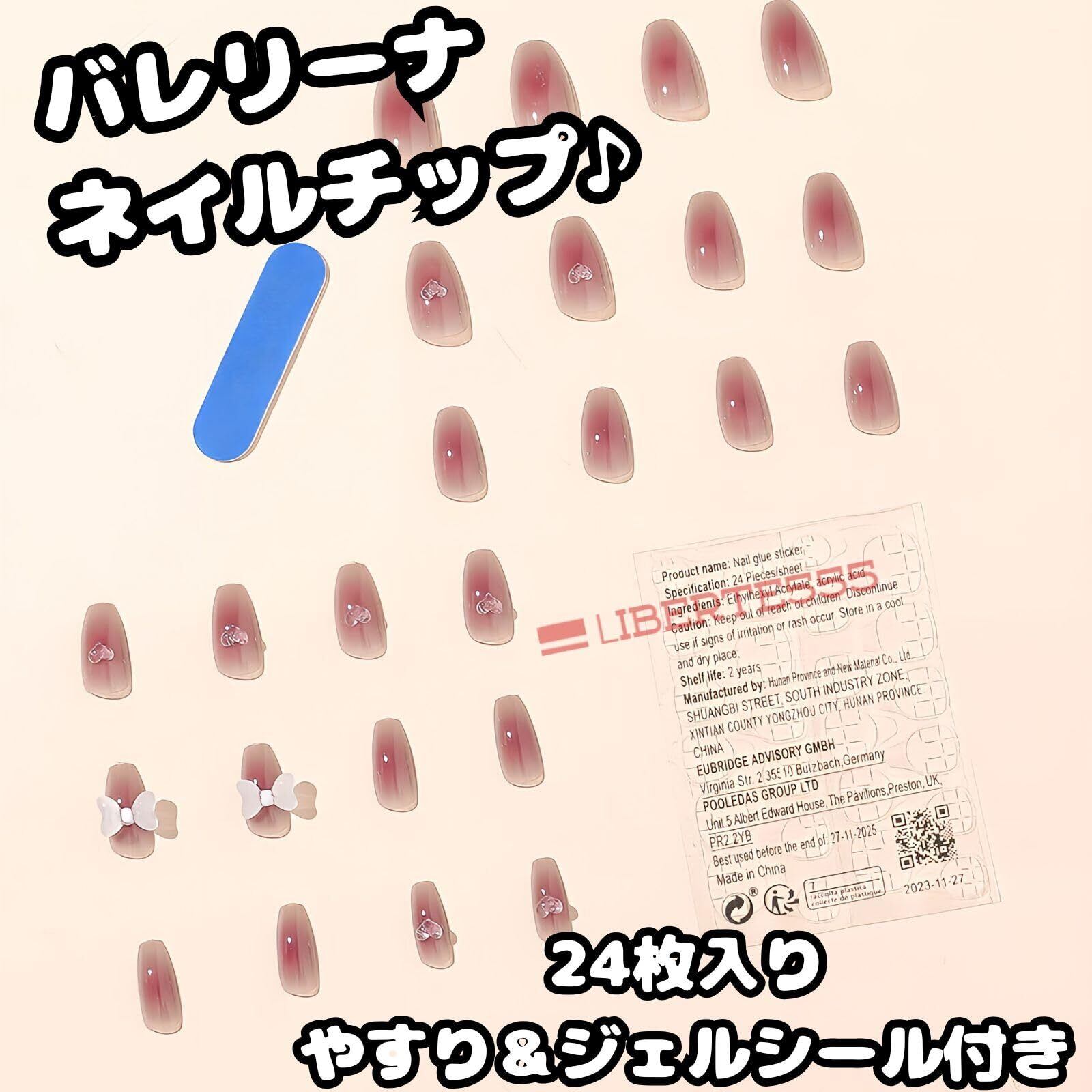 ネイルチップ バレリーナ 3d 韓国 可愛い フレンチ つけづめ つけ爪 シンプル nail (ピンクリボンハート, ロング)