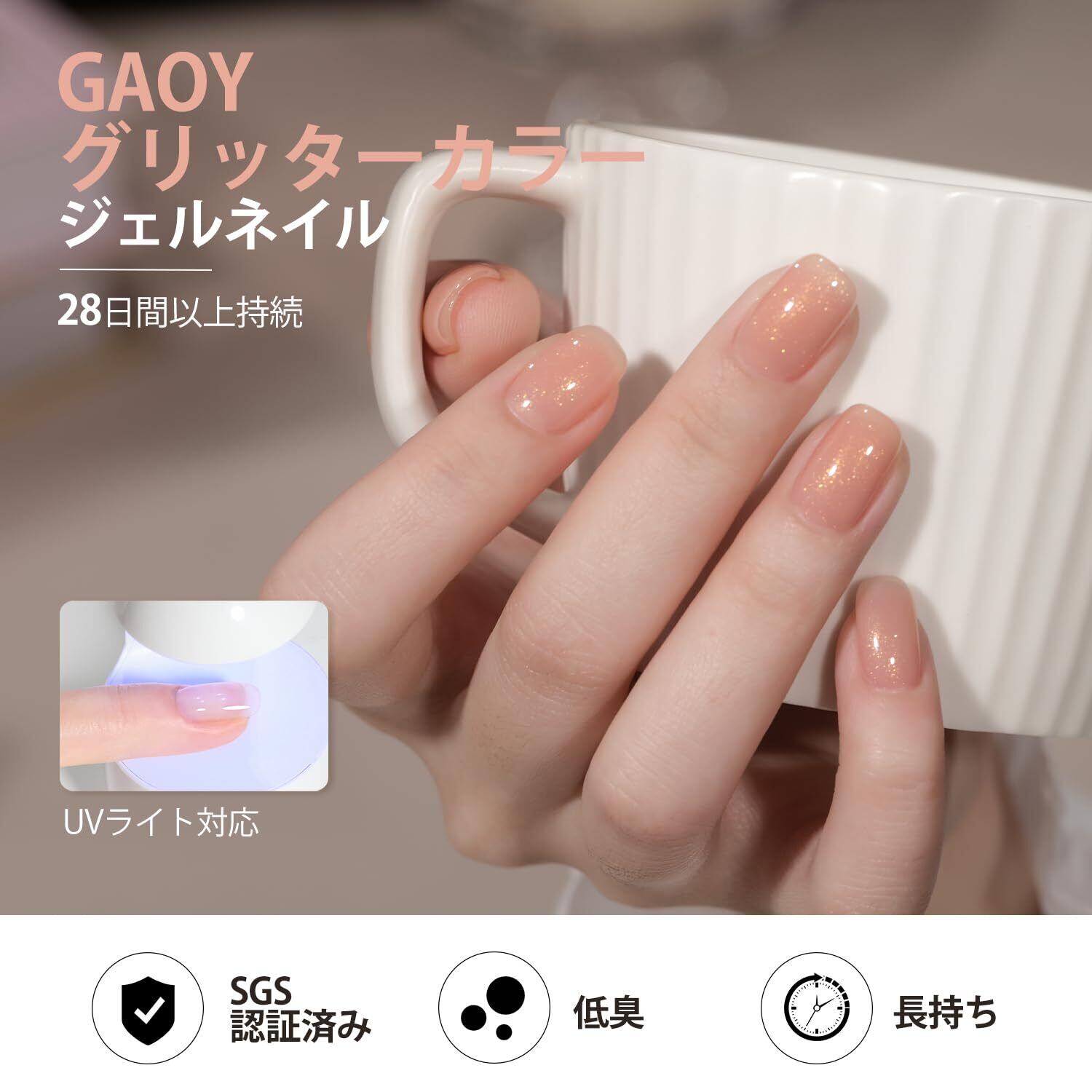 4週間長持ち: ベースジェルを塗る前に爪の表面を整えると、良いテクスチャーを作れます。カラージェルの後にトップジェルを塗ると、ツヤのある仕上がりになります。