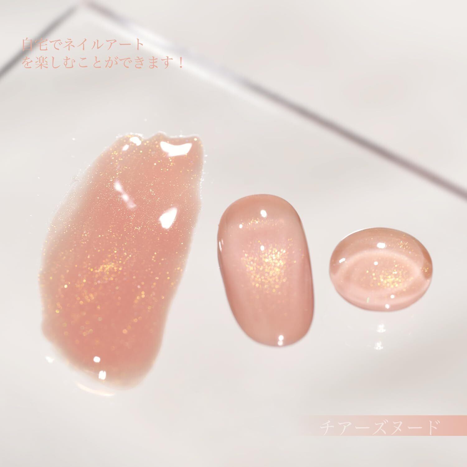 上品なきらめき:チアーズヌードは、肌なじみもよくラメも細かく上品なヌードカラーです。2度塗りで指先に幻想的な輝きを放ちます。